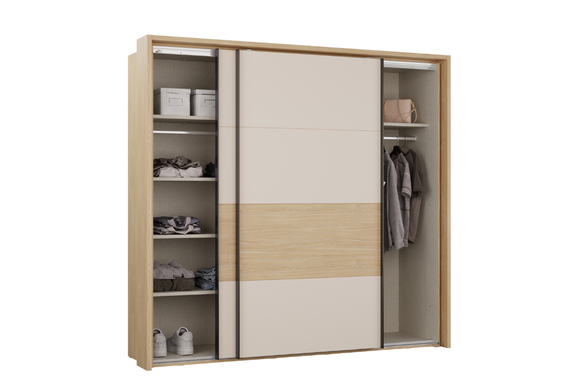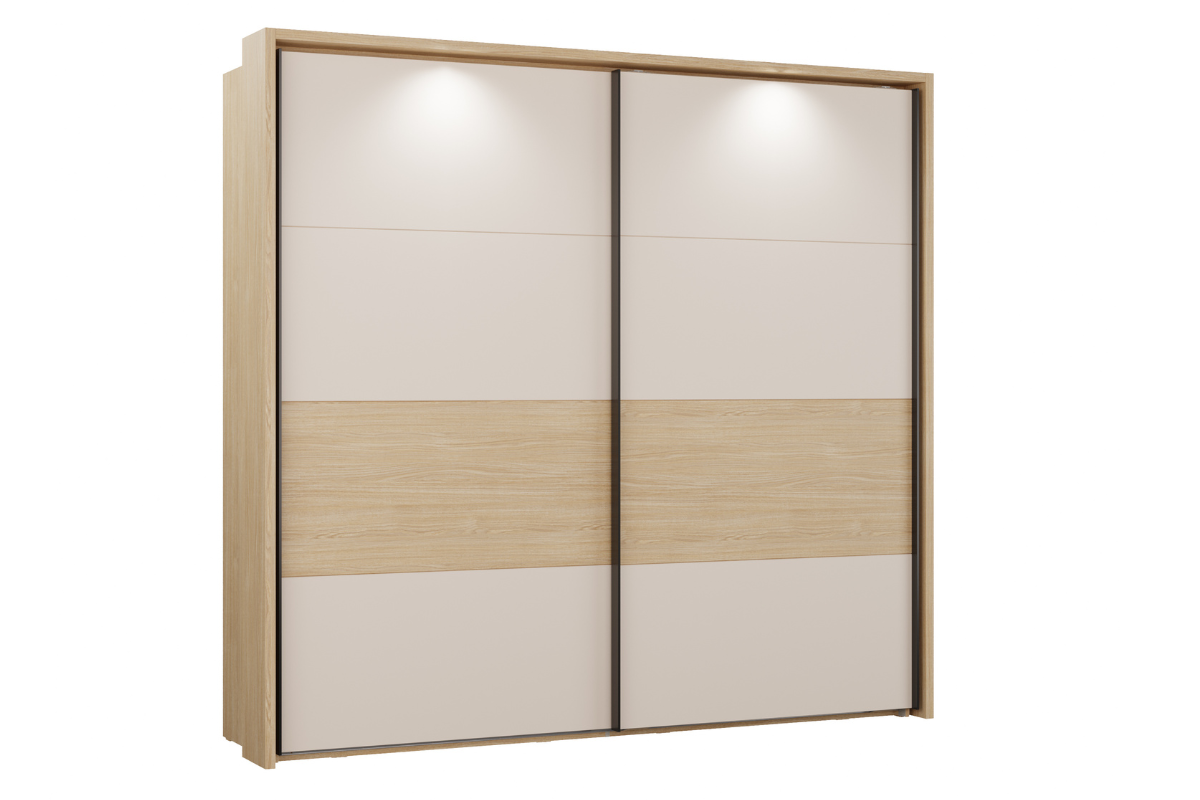 L’armoire Arno séduit par son design contemporain et ses finitions élégantes en chêne Elegancia et sable cachemire. Son style épuré apporte une touche douce et moderne à votre chambre. Équipée d’un éclairage intégré et d’un passepartout inclus, elle met en valeur son esthétique tout en offrant un espace de rangement fonctionnel et bien organisé.