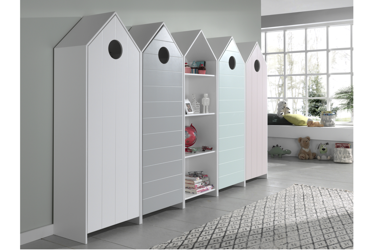 L' armoire CASAMI est fabriquée en MDF laqué de haute qualité. Elle est en forme de cabine de plage. La porte est décorée avec des lignes verticales. Vous pouvez choisir d'installer une tringle et 3 tablettes ou 4 tablettes. Le coloris blanc satiné de l'armoire est facile à combiner avec la décoration de la chambre de votre enfant. Venez le découvrir dans notre showroom Meubles Belot à Soignies.
