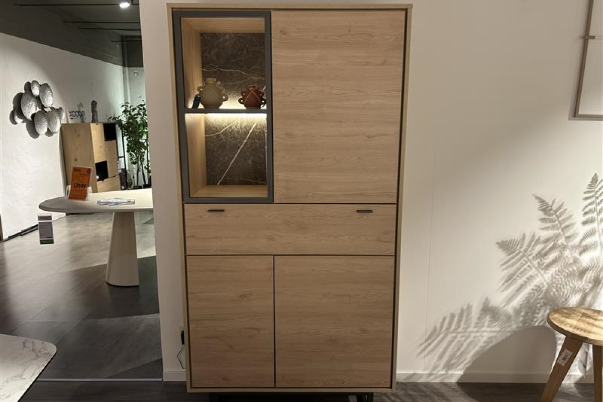 Modèle d'exposition ou stock restant. L'armoire sans poignée HELSINKI est composée de 3 portes, son tiroir et 2 niches. Elle est fabriquée en finition chêne et possède des pieds droits de couleur graphite. Son style est à la fois minimaliste et élégant. Venez la découvrir dans notre showroom Meubles Belot à Soignies.