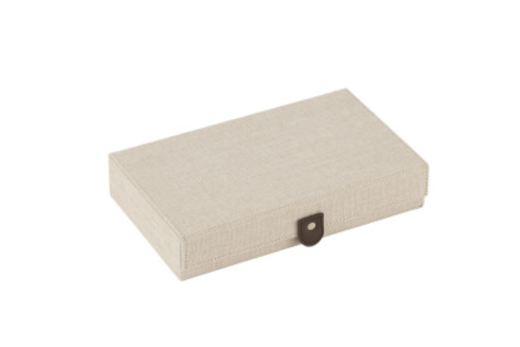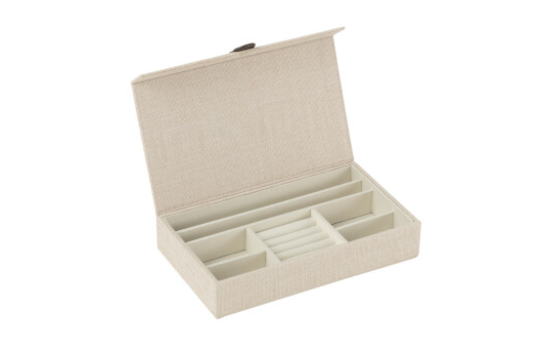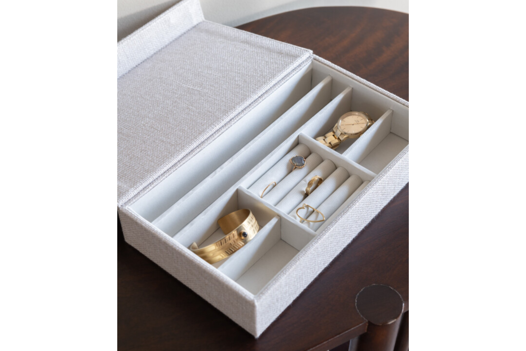 Cette élégante boîte à bijoux en polyester gris séduit par sa forme rectangulaire et son design sobre. Parfaite pour organiser vos bagues, colliers et bracelets, elle offre des compartiments bien pensés pour garder vos trésors en ordre. Un accessoire raffiné et pratique à disposer sur une coiffeuse ou dans une chambre, à découvrir chez Meubles Belot.