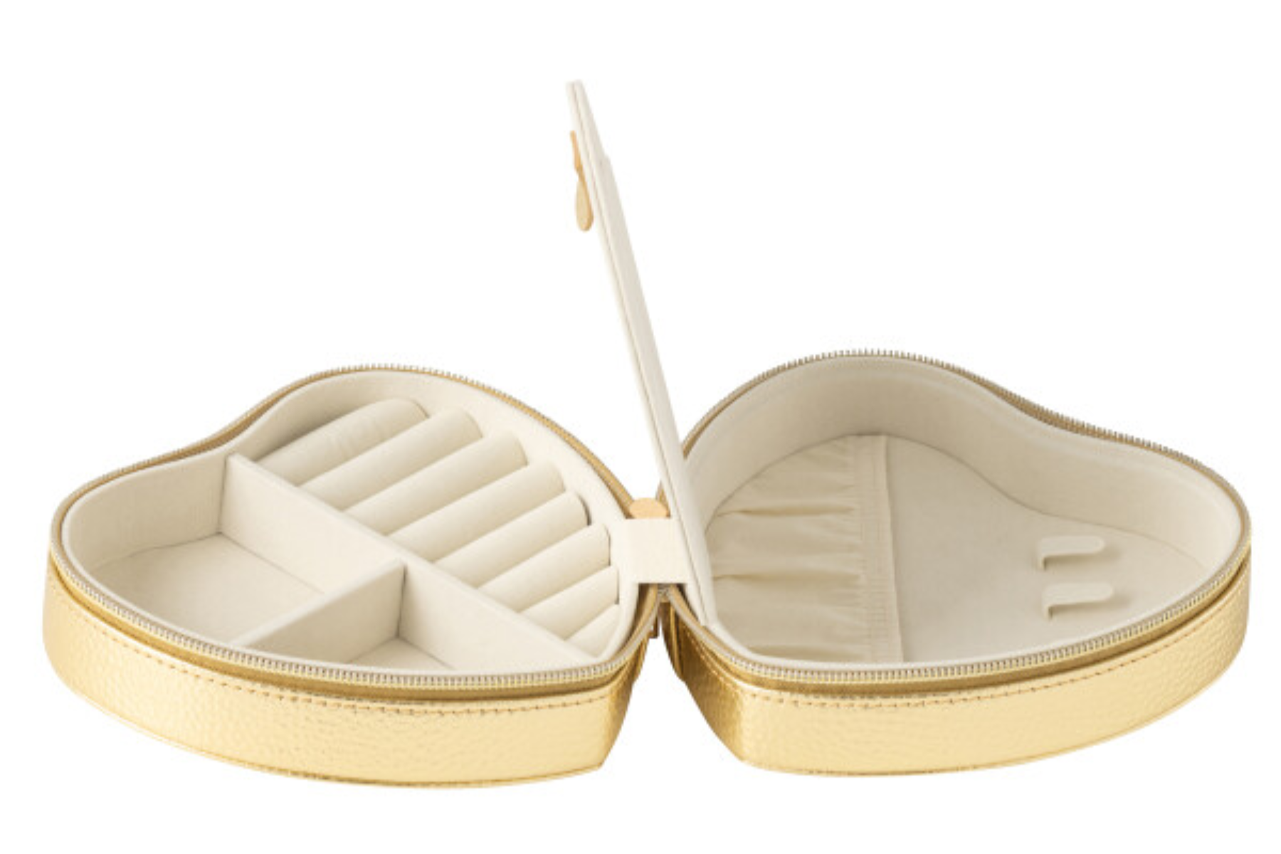 Cette boîte à bijoux en forme de cœur séduit par son élégance et sa finition dorée raffinée. Pratique et féminine, elle offre plusieurs compartiments pour ranger bagues, colliers et boucles d’oreilles avec soin. Un écrin chic et lumineux pour vos trésors du quotidien, à découvrir chez Meubles Belot.
