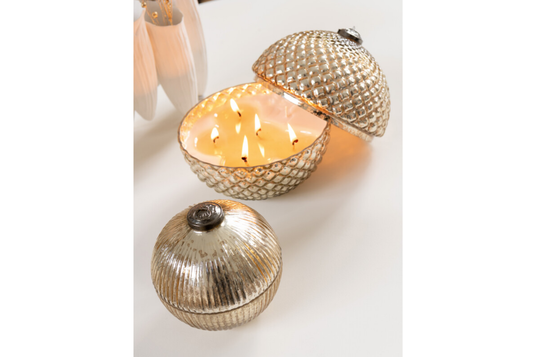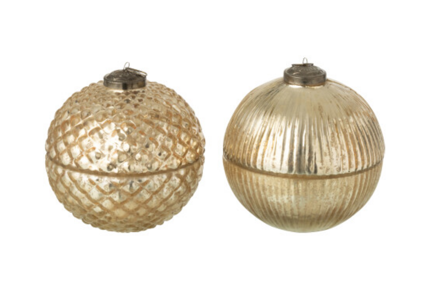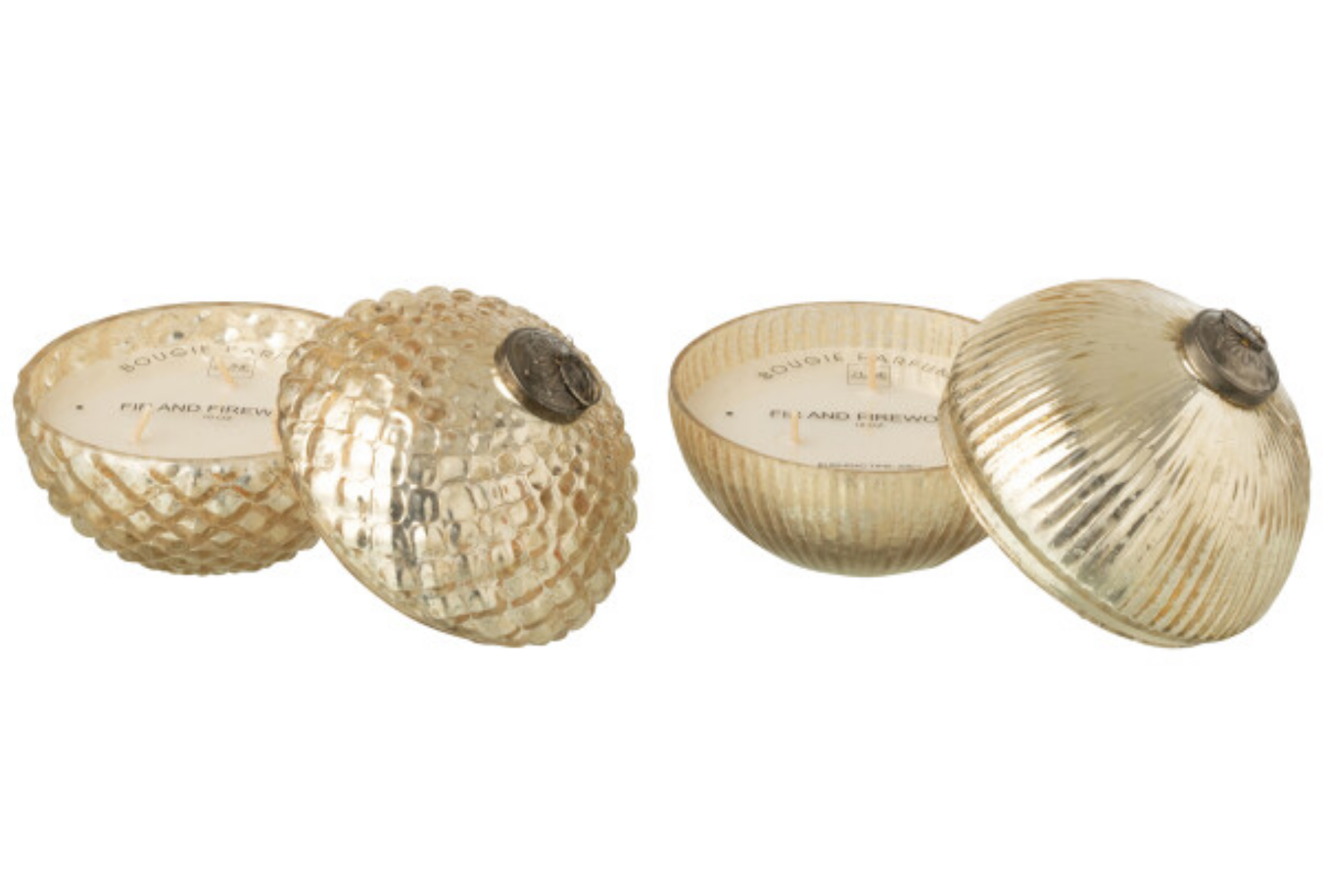 Ces bougies parfumées en forme de boule de Noël, en verre doré et proposées par assortiment de 2, diffusent une lueur douce et un parfum délicat pour une ambiance chaleureuse et élégante. Un vrai bijou décoratif pour les fêtes, à découvrir chez Meubles Belot.