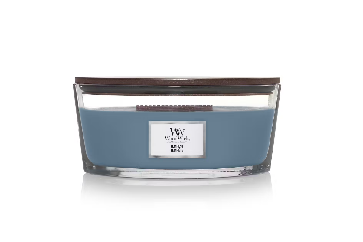 Bougie ellipse Tempête de la marque Woodwick. Un parfum où des embruns marins éclairent un accord subtil de bois minéral, de lys et de cristaux perlés. Idéal pour sublimer votre intérieur ou pour offrir.