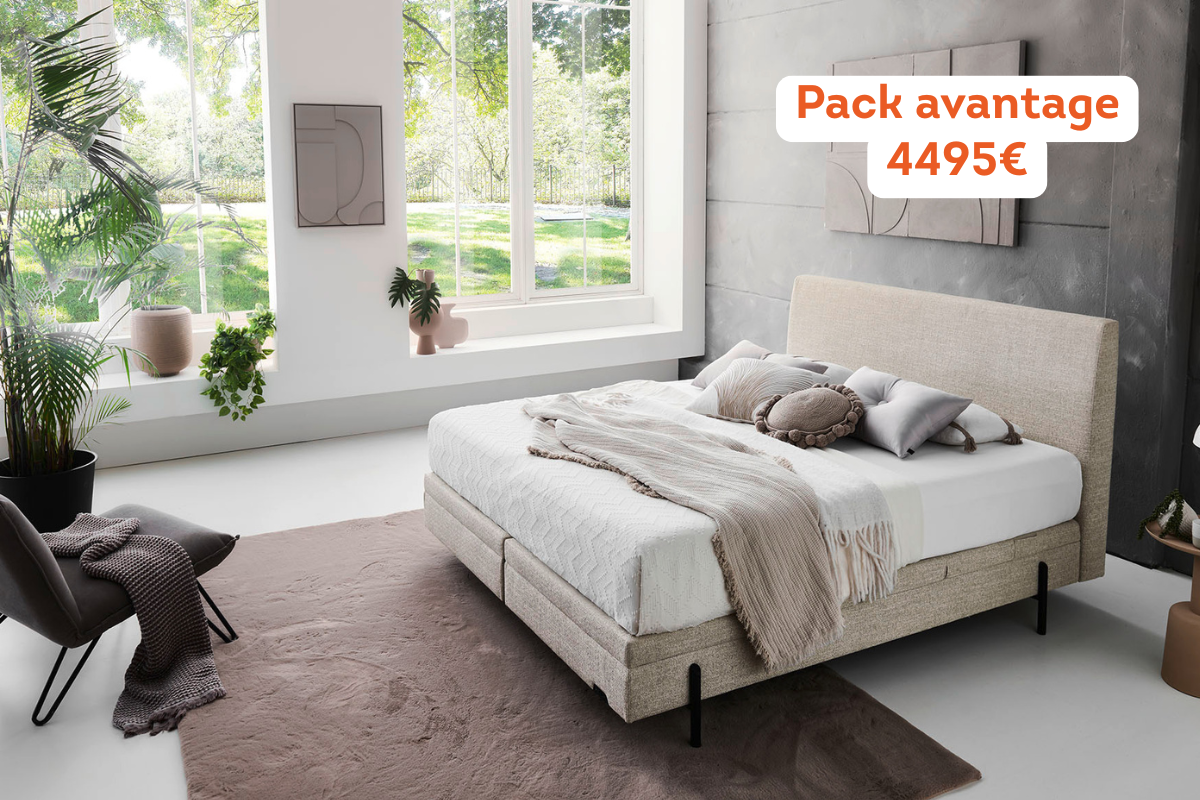 Le Boxspring Imagine Fixe 2 couches associe confort et élégance dans une configuration pensée pour des nuits parfaites. Avec sa tête de lit Lines de 180 cm, ses deux box fixes Imagine 90x200 cm (épaisseur 25 cm) et ses pieds Viva de 15 cm, il allie robustesse et design raffiné. Le confort est assuré par deux matelas 90x200 cm Delight Airflow, offrant un soutien ferme et medium, pour une adaptabilité optimale. L’ensemble est habillé dans un tissu Soda Forest, qui apporte une touche moderne et intemporelle, à découvrir chez Meubles Belot.
