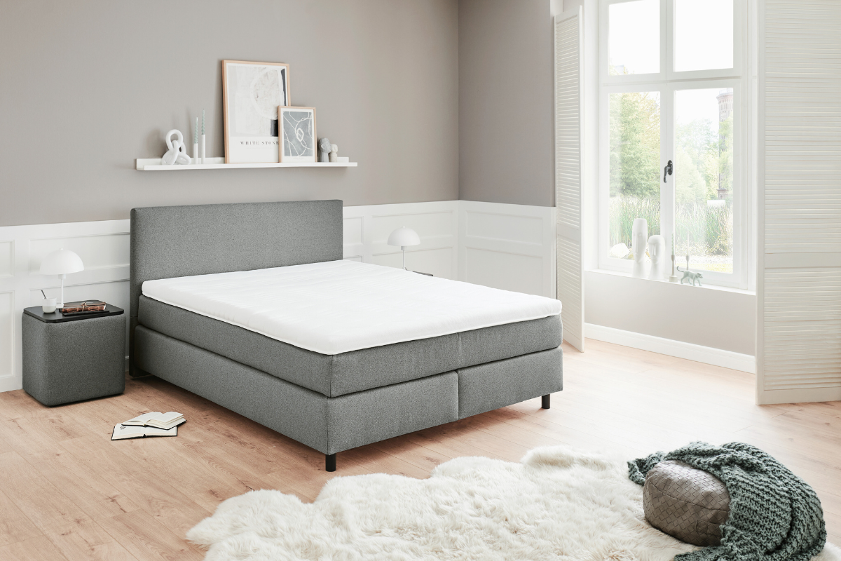 Modèle d'exposition ou stock restant. Le Boxspring HYPNOS 160cm allie élégance et confort absolu. Revêtu du tissu Brego Silver, il est sublimé par une tête de lit de 105 cm et des pieds noirs mats Signa de 10cm, apportant modernité et finesse à votre chambre. Côté confort, il est équipé du matelas MS 238 à ressorts ensachés 5 zones, proposé en confort medium, idéal pour un soutien équilibré et un sommeil réparateur. Le tout est complété par un topper en mousse froide de 8 cm, qui apporte douceur et maintien supplémentaire. Un véritable cocon de bien-être qui transforme vos nuits en instants d’exception, à retrouver chez Meubles Belot.