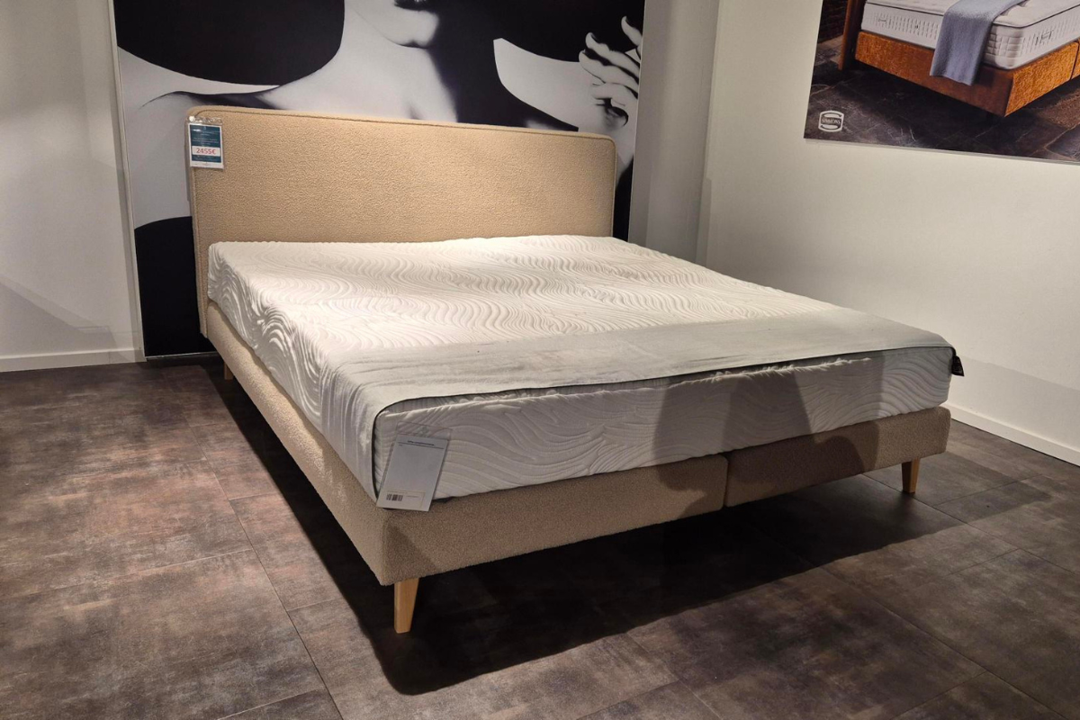 Modèle d'exposition. Boxspring TENDANCE de la marque Simmons composé d'une tête de lit de 180cm de large et 83cm de haut, de 2 SmartBox, le tout recouvert d'unt issu Teddy dans une douce couleur Café au lait et reposant sur des pieds Scandinave teinte Naturel. Venez essayer chez Meubles Belot cet équilibre harmonieux entre confort et style pour des nuits reposantes.