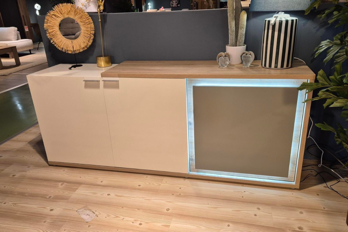 Modèle d'exposition ou stock restant. Le buffet ASOLA 3 portes séduit par son design épuré et son esprit modulable. En chêne naturel et façades laquées (blanc brillant / vert sauge satiné), il offre un style contemporain et chaleureux. Son système push-to-open dissimule un large espace de rangement, idéal pour un intérieur organisé et élégant.