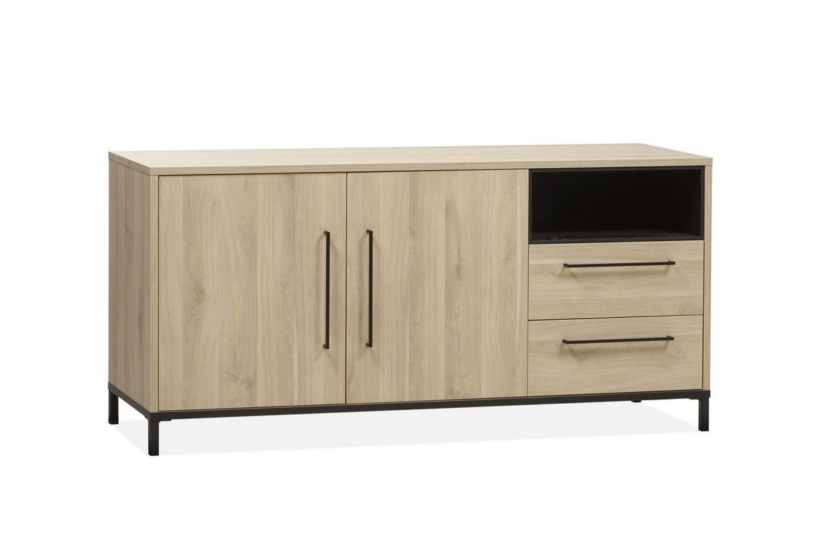 Dressoir 2 portes, 2 tiroirs et 1 niche de la collection Bridge de Maxfurn en lamulux fresh oak et old piano. Lamulux représente la solution parfaite pour le consommateur qui veut l’expérience d’un matériel massif sans les désavantages de l’entretien et le coût d’un meuble massif. Lamulux a la ressemblance et le même touché que le bois massif ! Pieds en métal noir. Fermeture soft-close. Éclairage led inclus. Venez le découvrir dans notre showroom Meubles Belot à Soignies.