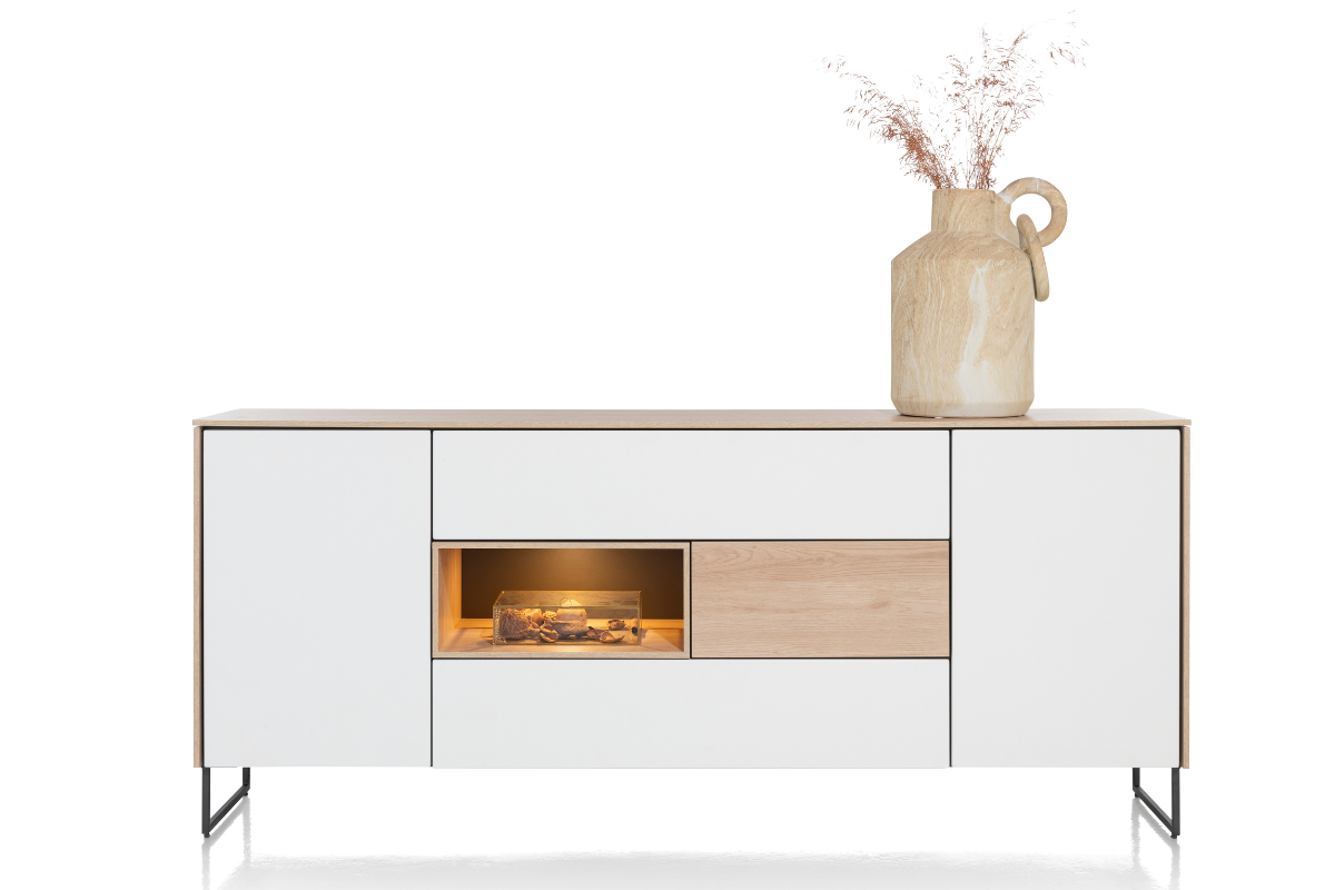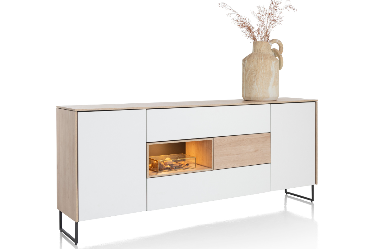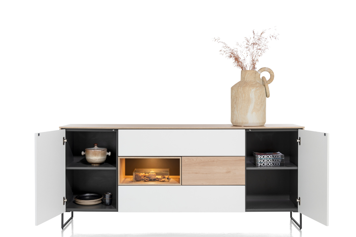Le buffet LINDFIELD est composé de 2 portes, 3 tiroirs et une niche avec éclairage LED. Venez le découvrir dans notre showroom Meubles Belot à Soignies.