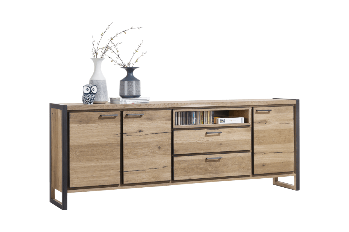 Découvrez un espace de rangement spacieux et une fusion d'influences avec ce magnifique buffet. Composé de 3 portes, 2 tiroirs et 1 niche, ce meuble de 240 cm associe l'élégance du bois à la modernité du métal, créant ainsi un design à la fois original et intemporel. Équipé d'un éclairage LED, il s'intègre parfaitement dans un couloir, un bureau ou un séjour. Ne manquez pas l'occasion de le découvrir dans notre showroom Meubles Belot à Soignies !