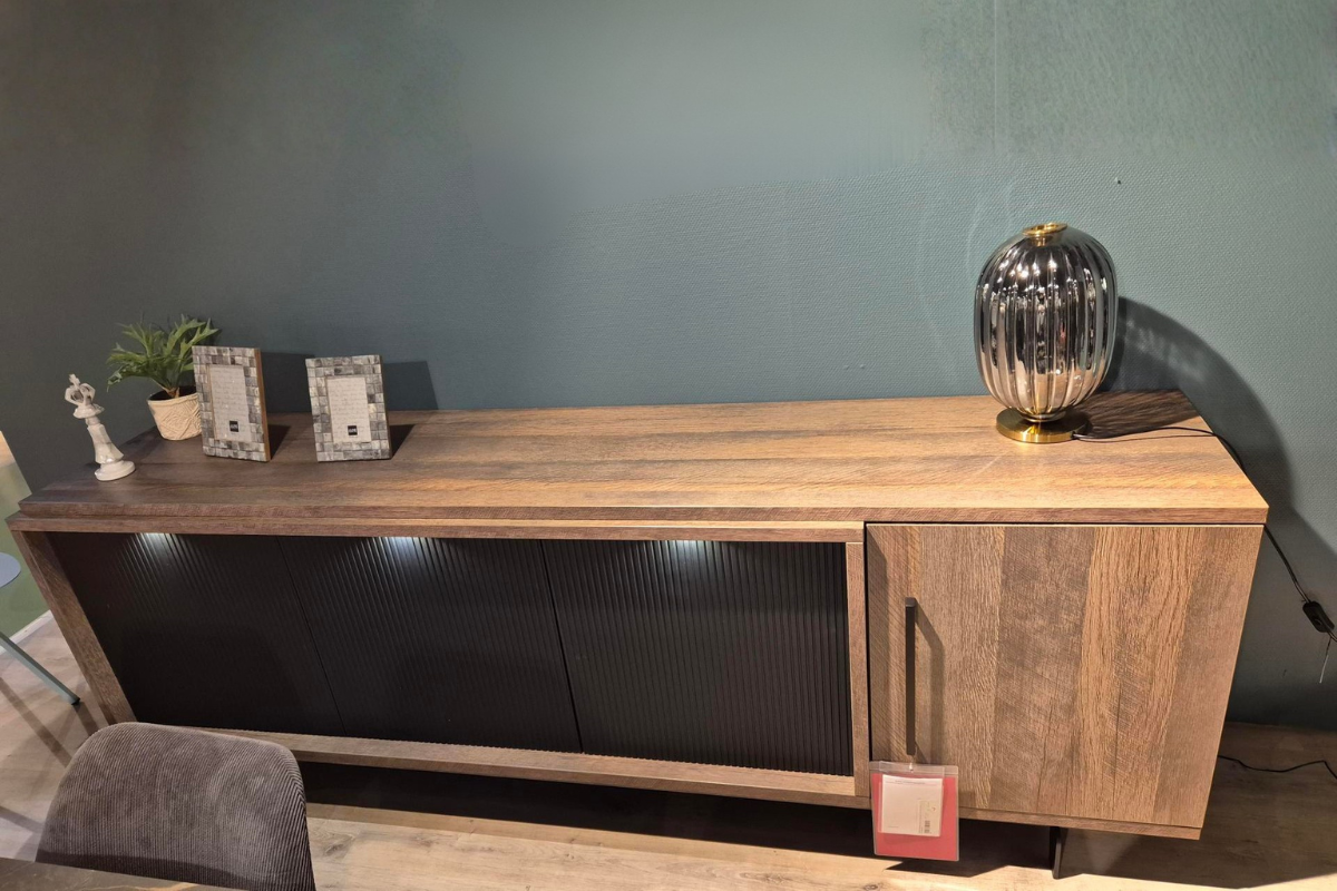 Modèle d'exposition. Dressoir large 4 portes de couleur chêne doré et noir mat au style actuel qui mettra votre séjour en valeur. Venez le découvrir dans notre showroom Meubles Belot à Soignies.