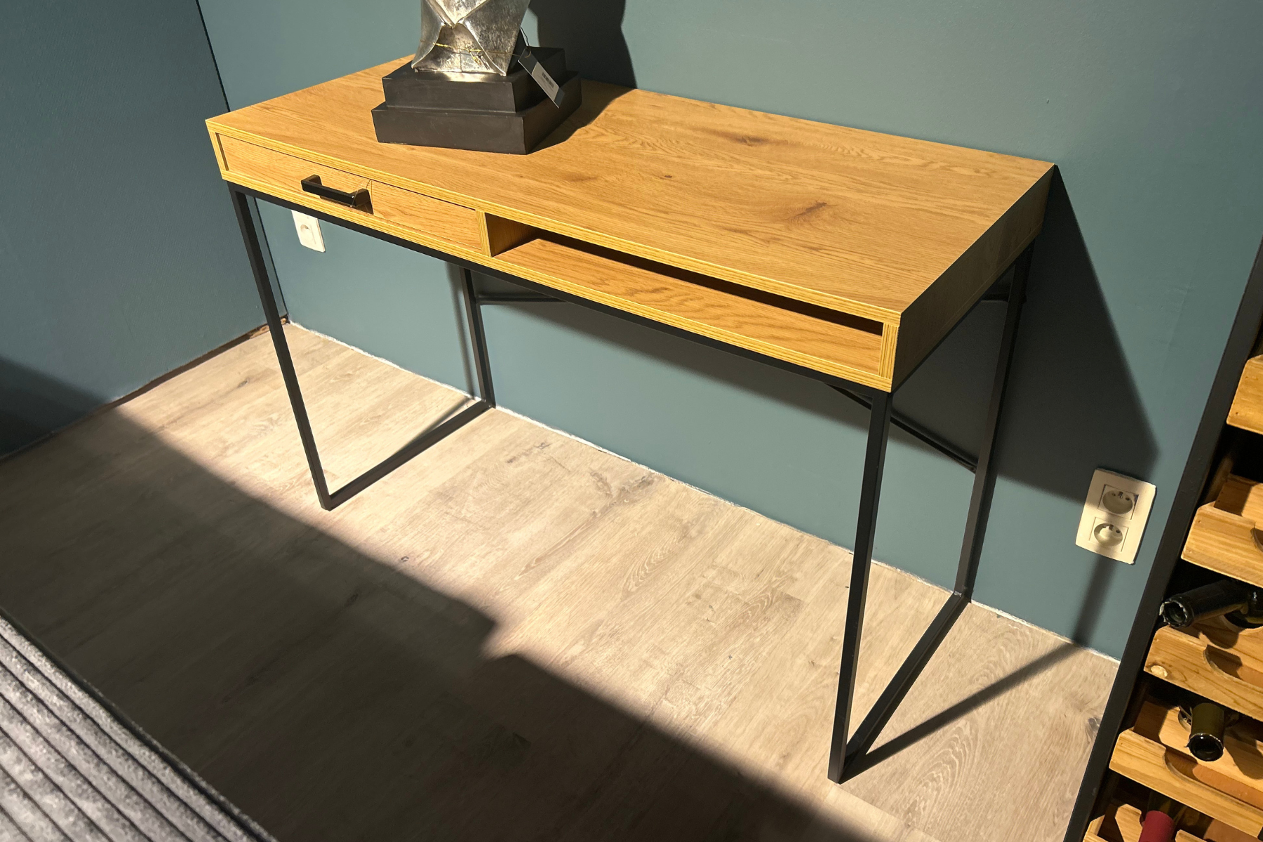 Modèle d'exposition ou stock restant. Augmentez votre productivité grâce à ce bureau élégant avec beaucoup d'espace de rangement. Ce bureau complètera une pièce avec style et est conçu pour se fondre dans de nombreux styles de décoration. Il présente un dessus de table avec un effet chêne sauvage saisissant et est soutenu par une base en métal enduit de poudre noire Il dispose d'un tiroir pour un rangement à l'abri des regards et d'un cube pour papiers et livres. Venez le découvrir dans notre showroom Meubles Belot à Soignies.