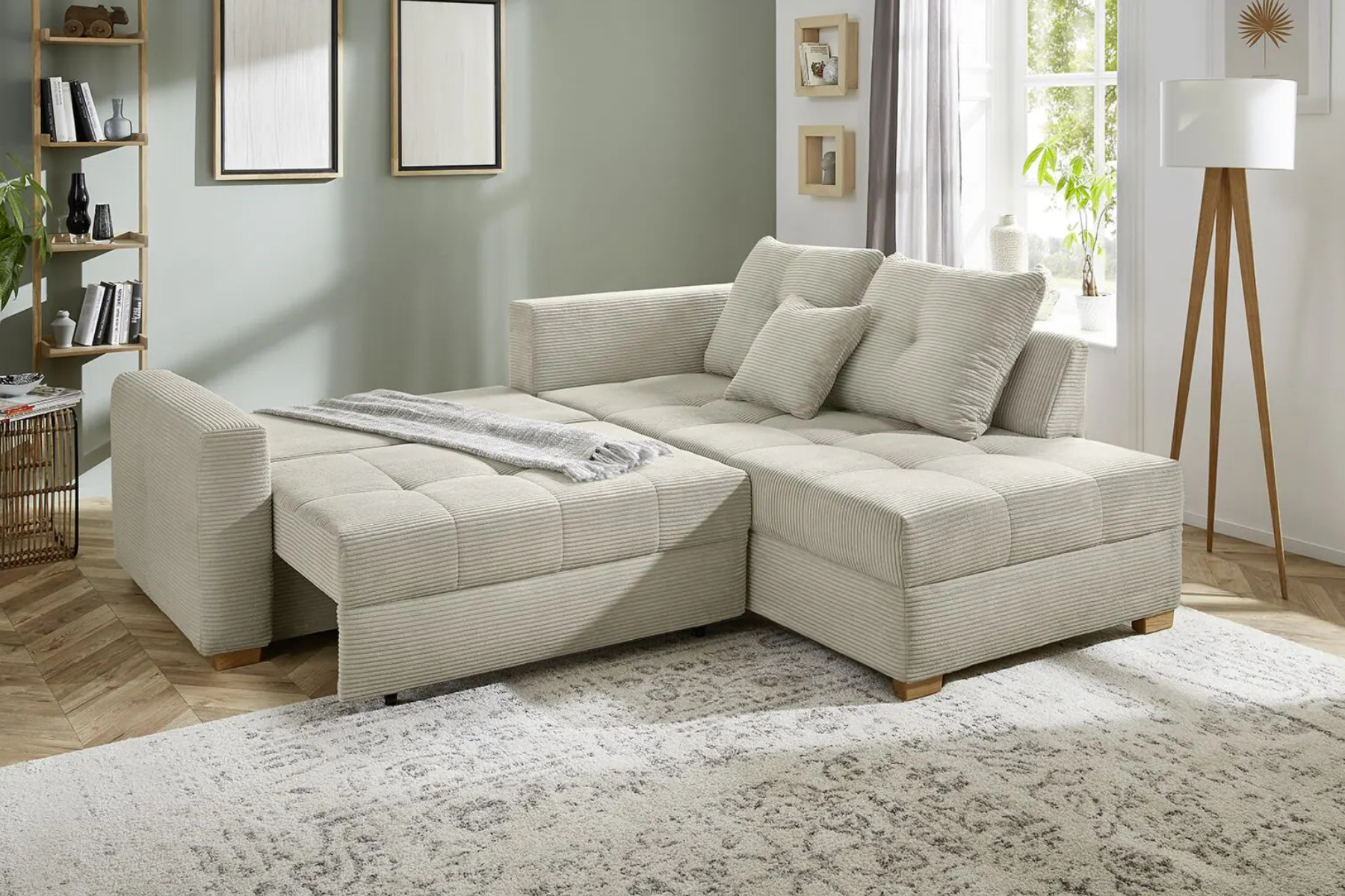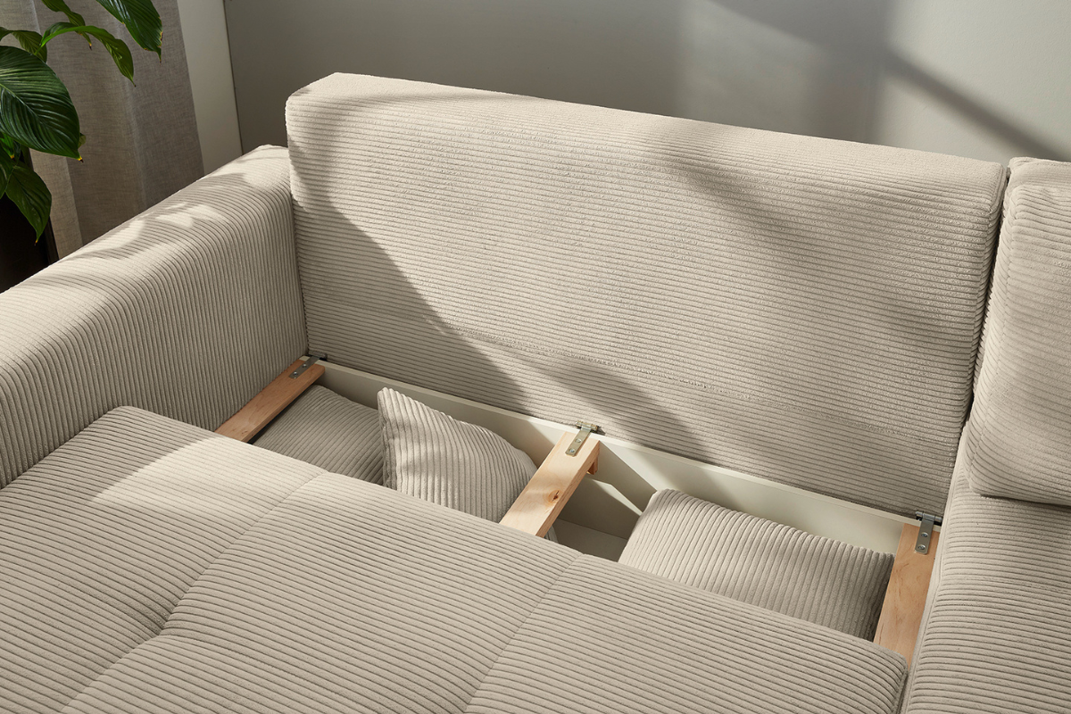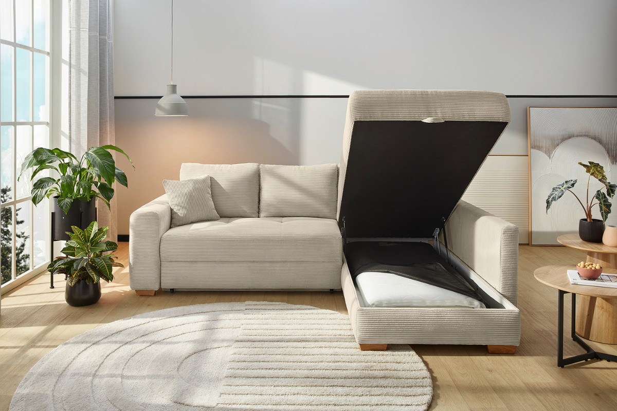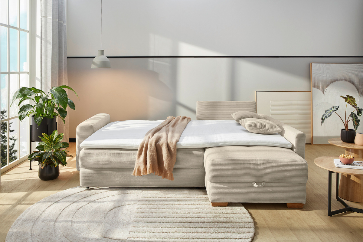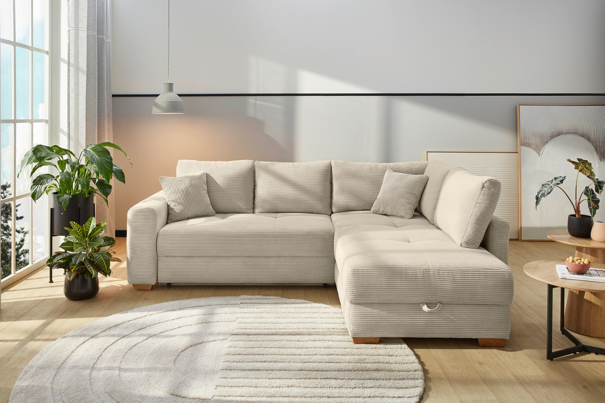 Le canapé-lit SUNSET en tissu beige a un angle réversible. Son assise coulissante permet de le transformer facilement en lit 160x220 cm, idéal en couchage d’appoint. Il dispose d’un grand coffre de rangement intégré, parfait pour y glisser oreillers, couettes ou plaids. Le confort est assuré grâce au topper inclus et aux ressorts ensachés dans les assises et dossiers. Découvrez la collection de canapés-lits chez Meubles Belot.