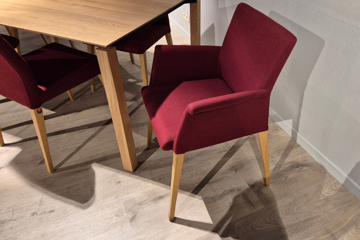 Modèle d'exposition ou stock restant. Chaise PURE CLASSIC C0212 avec accoudoirs de la marque belge design Mobitec. Ce modèle intemporel est apprécié pour son incroyable longévité à travers les années. Elle est ici proposée en tissu Otello rouge et pieds E11 chêne, soutenus par des patins en plastique pour une meilleure tenue. Découvrez son confort et sa robustesse chez Meubles Belot.