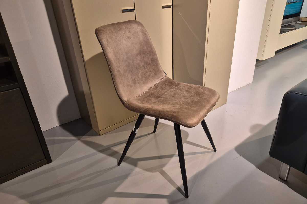 Modèle d'exposition ou stock restant. Chaise en micro-tissu softyl de couleur galet combinant la douceur du velours et l’esthétique du cuir à une très grande solidité. Cette chaise est confortable et ses pieds apportent une touche originale. Venez le découvrir dans notre showroom Meubles Belot à Soignies.
