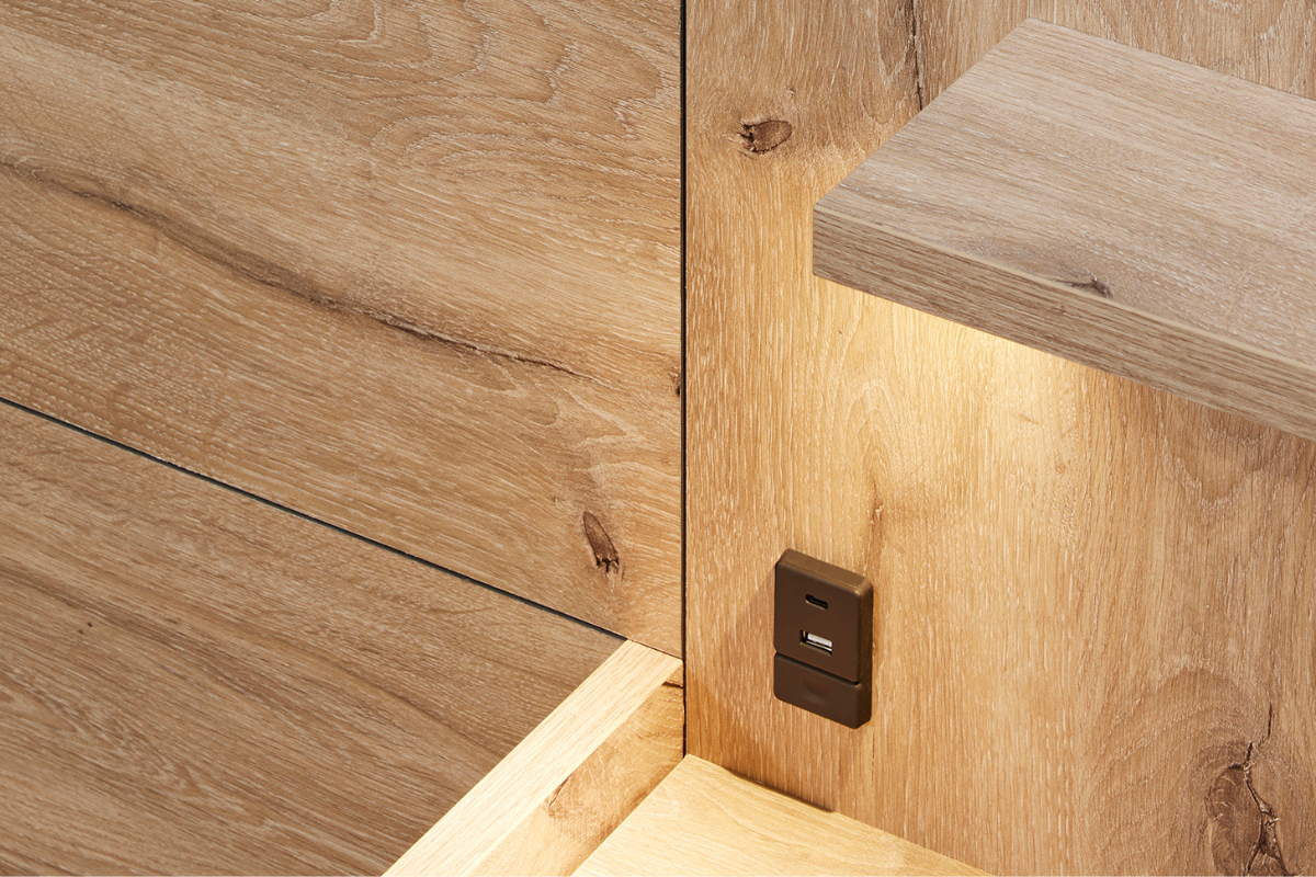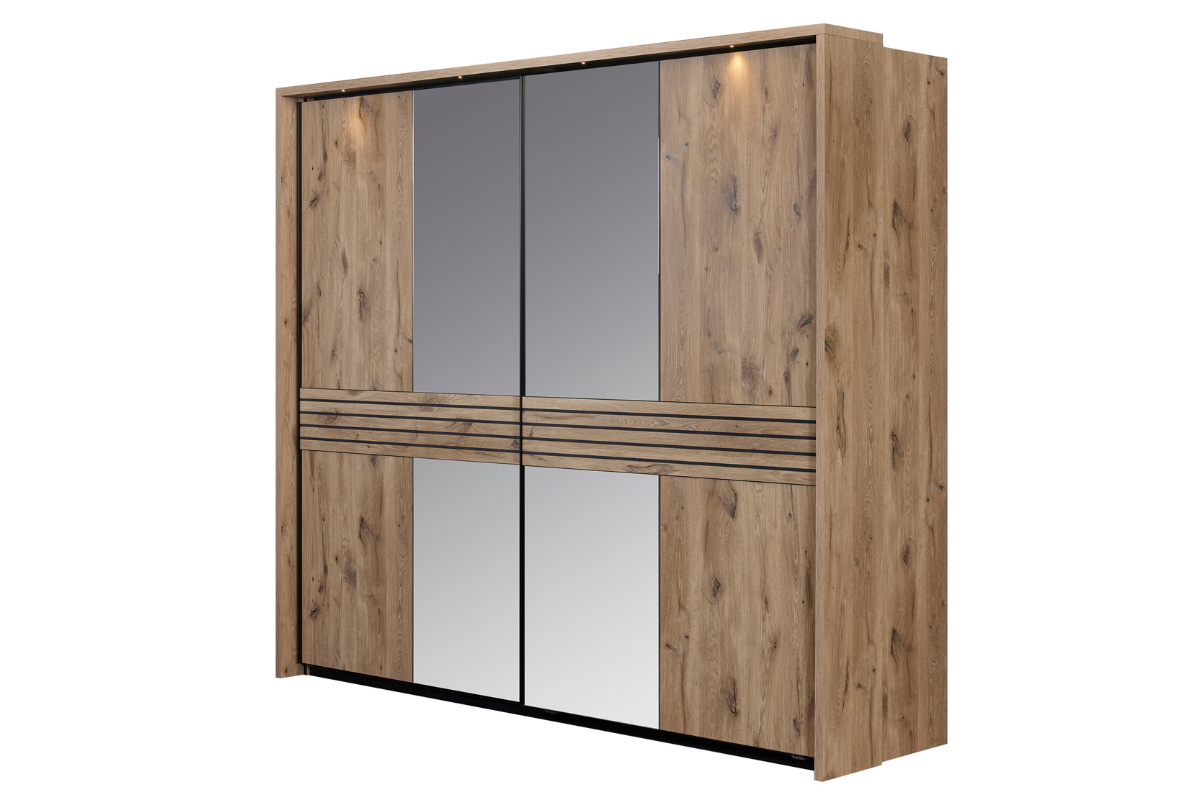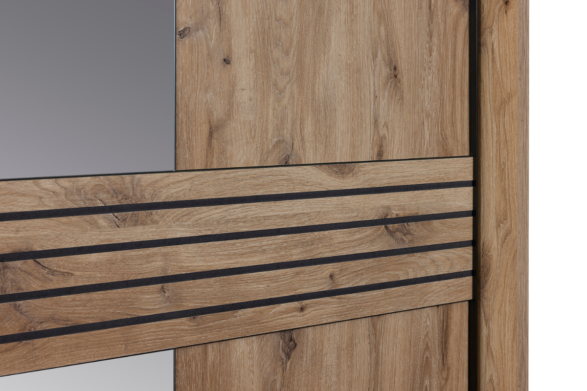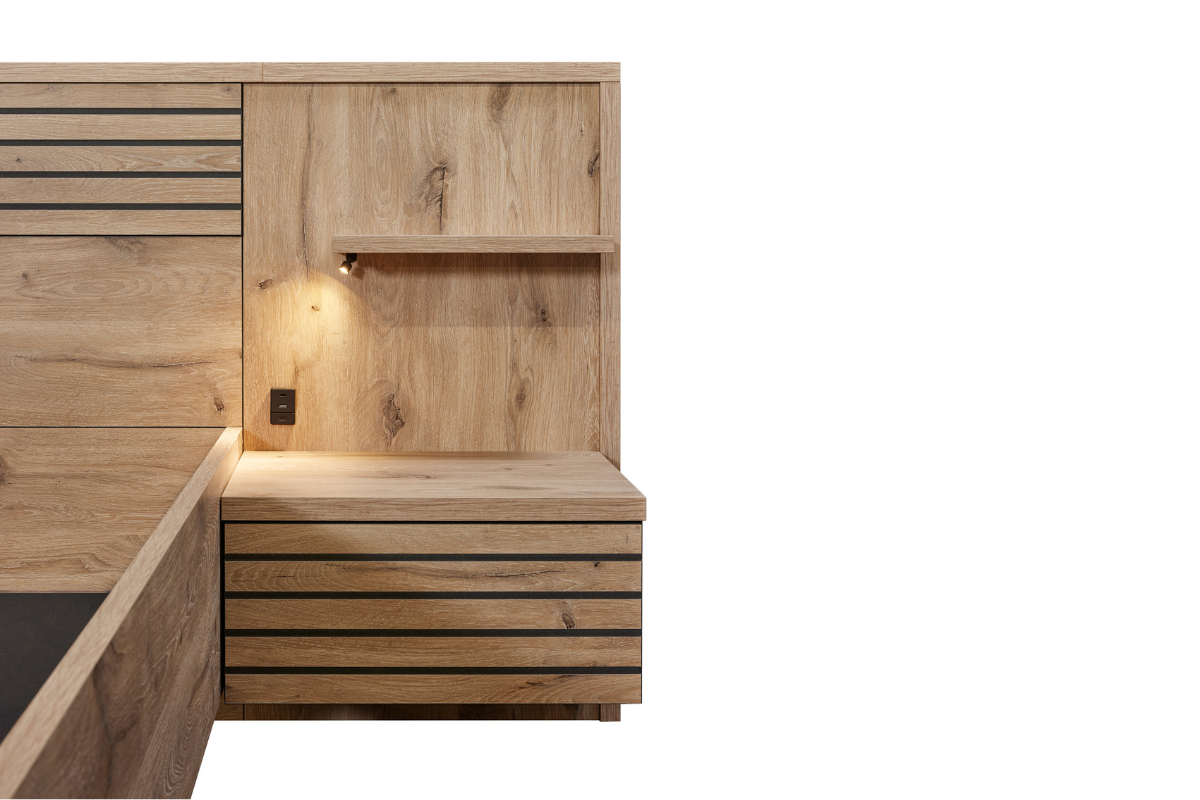La chambre Tanya est un ensemble complet au design naturel et chaleureux, composé d’une armoire avec portes miroir, d’un lit avec une tête de lit structurée et de deux chevets assortis. Les lignes rainurées, les finitions bois clair et les éclairages intégrés créent une ambiance moderne et apaisante. À retrouver chez Meubles Belot.