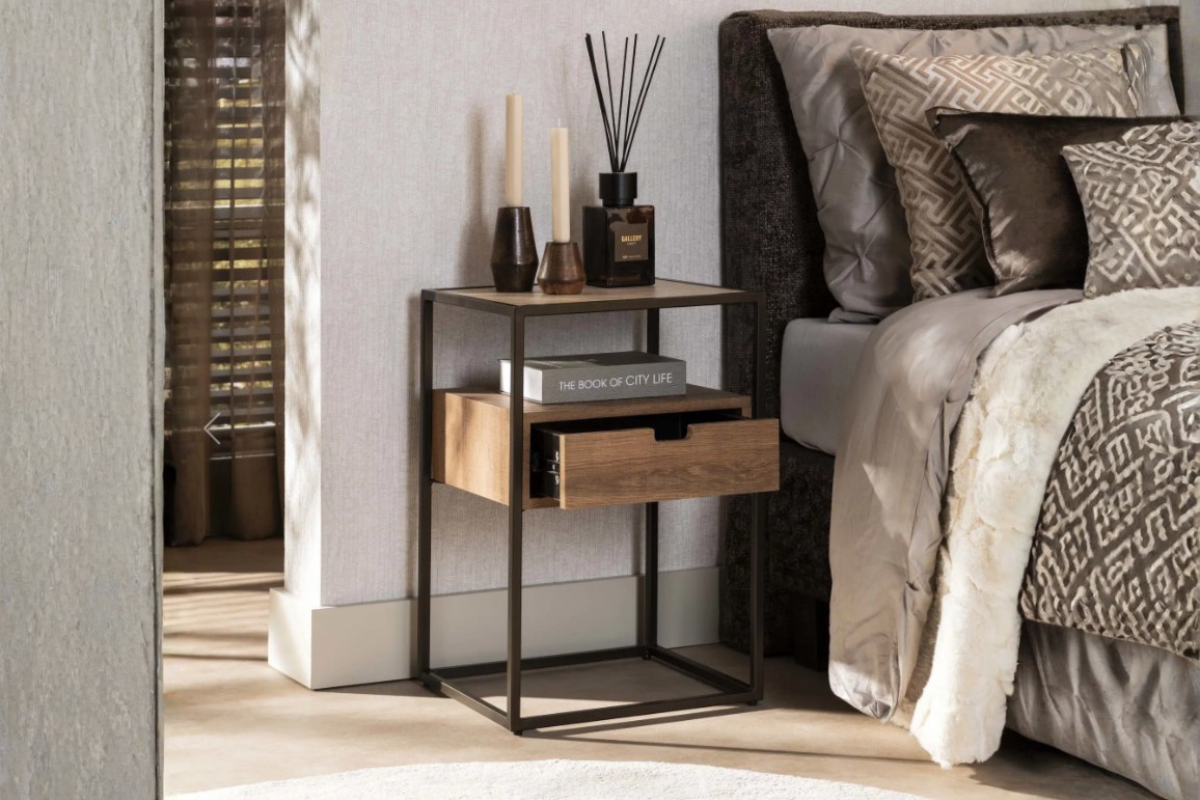La table de chevet CASSETTO associe élégance et praticité avec son cadre en métal finition bronze et son tiroir aspect chêne. Son plateau en céramique finition travertin apporte une touche minérale et raffinée à votre chambre. Un meuble aussi fonctionnel qu’esthétique à découvrir chez Meubles Belot.