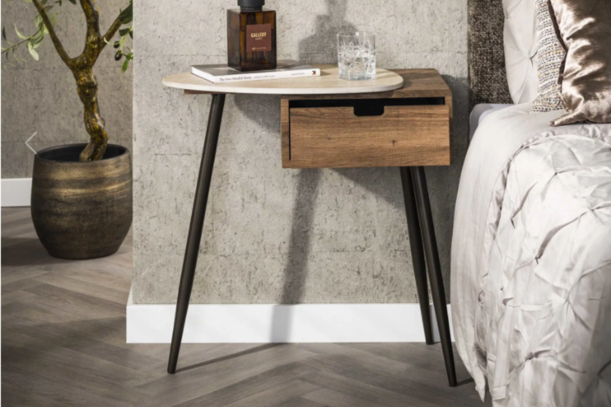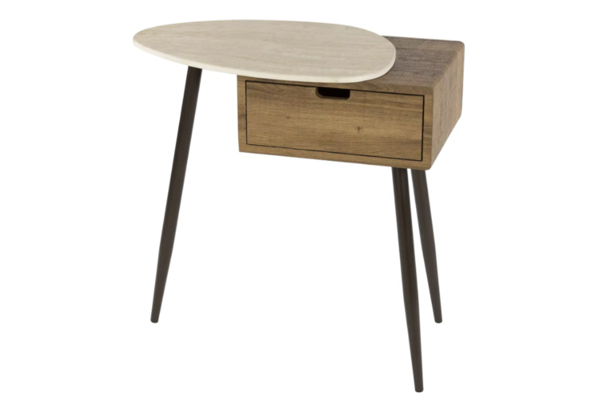 La table de chevet Travino, version 1 tiroir gauche, associe élégamment un plateau en céramique finition travertin à un tiroir aspect chêne. Ses pieds en métal couleur bronze apportent une touche raffinée, idéale pour sublimer l’espace nuit avec style et fonctionnalité, à découvrir chez Meubles Belot.