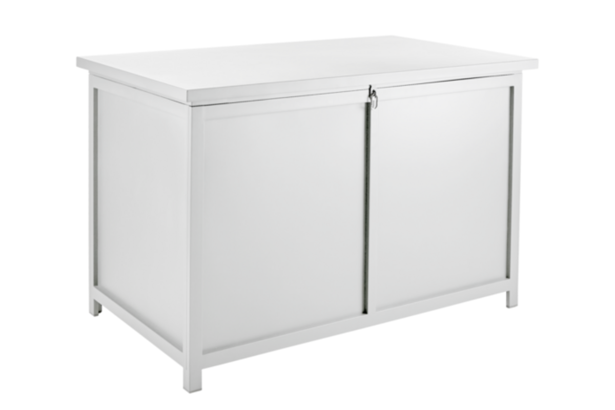 La box de rangement Hide en blanc de 125cm cache presque tout avec élégance. Fabriquée en aluminium, elle dispose d’une fonction de verrouillage. Son ouverture assistée par ressort à gaz assure une manipulation fluide, tandis que son couvercle robuste permet également de l’utiliser comme surface d’appoint. À découvrir chez Meubles Belot.