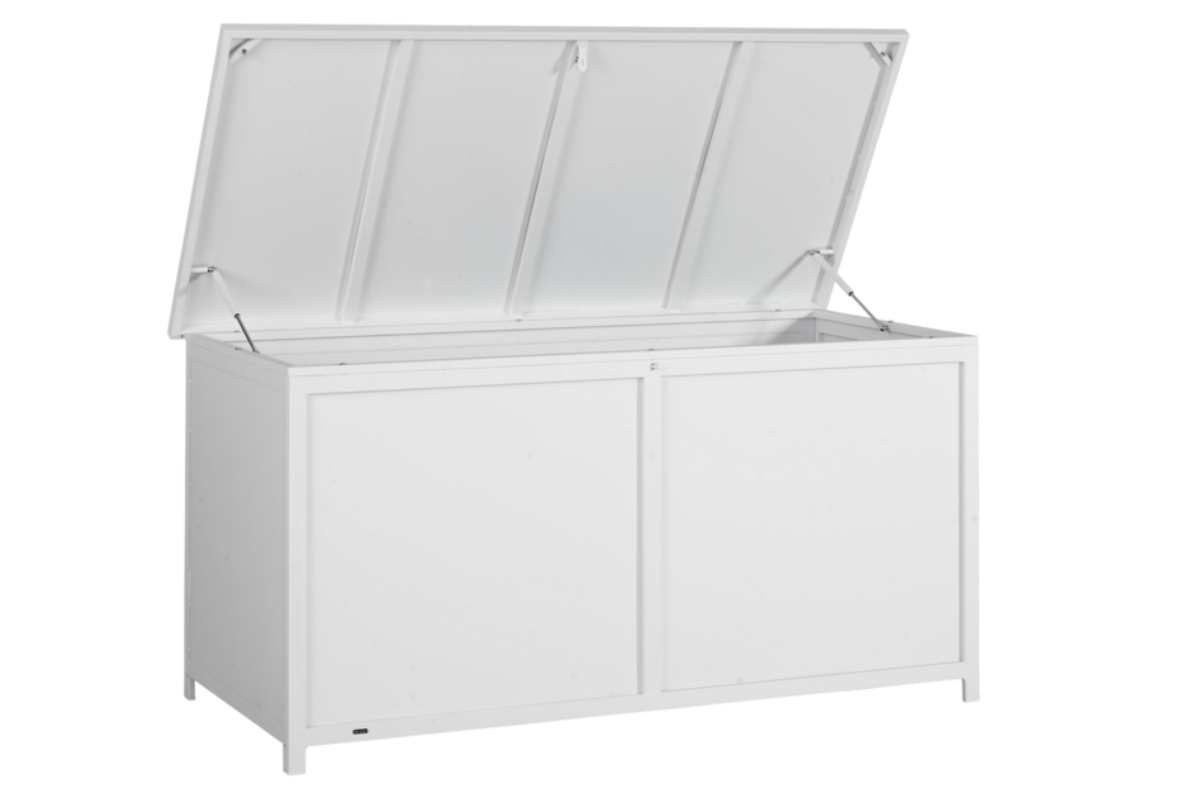La box de rangement Hide en blanc de 177cm est la solution élégante pour garder votre extérieur parfaitement organisé. Elle est conçue en aluminium et est dotée d’un système de verrouillage, d’une ouverture fluide grâce au ressort à gaz et d’un couvercle robuste pouvant servir de surface d’appoint, elle allie praticité et design minimaliste. À découvrir chez Meubles Belot.
