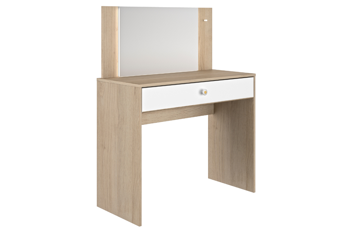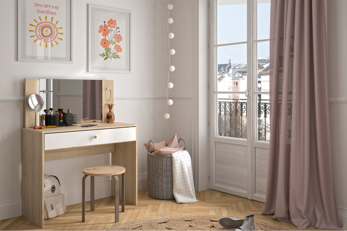 Alliez praticité et élégance avec la coiffeuse Make-Up, dotée d’un large miroir et d’un tiroir de rangement. Sa finition en chêne naturel apporte douceur et modernité à votre chambre, à découvrir chez Meubles Belot.