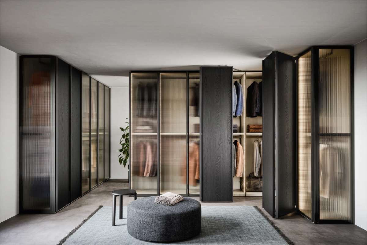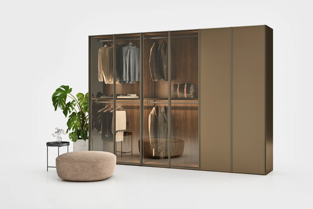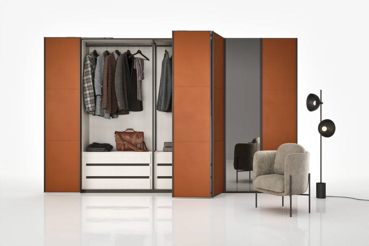 La collection Perry propose des armoires élégantes et personnalisables, mêlant cadre métallique et panneaux en verre ou en matériaux nobles comme le cuir. Combinables entre eux, les différents types de portes permettent de créer un rangement parfaitement adapté à vos besoins. Grâce au système d’ouverture Panorama à 180°, l’accès à l’intérieur est facilité, même dans les angles. Perry allie finesse, modularité et fonctionnalité. Découvrez-la dans notre showroom à Soignies et concevez votre armoire sur mesure.