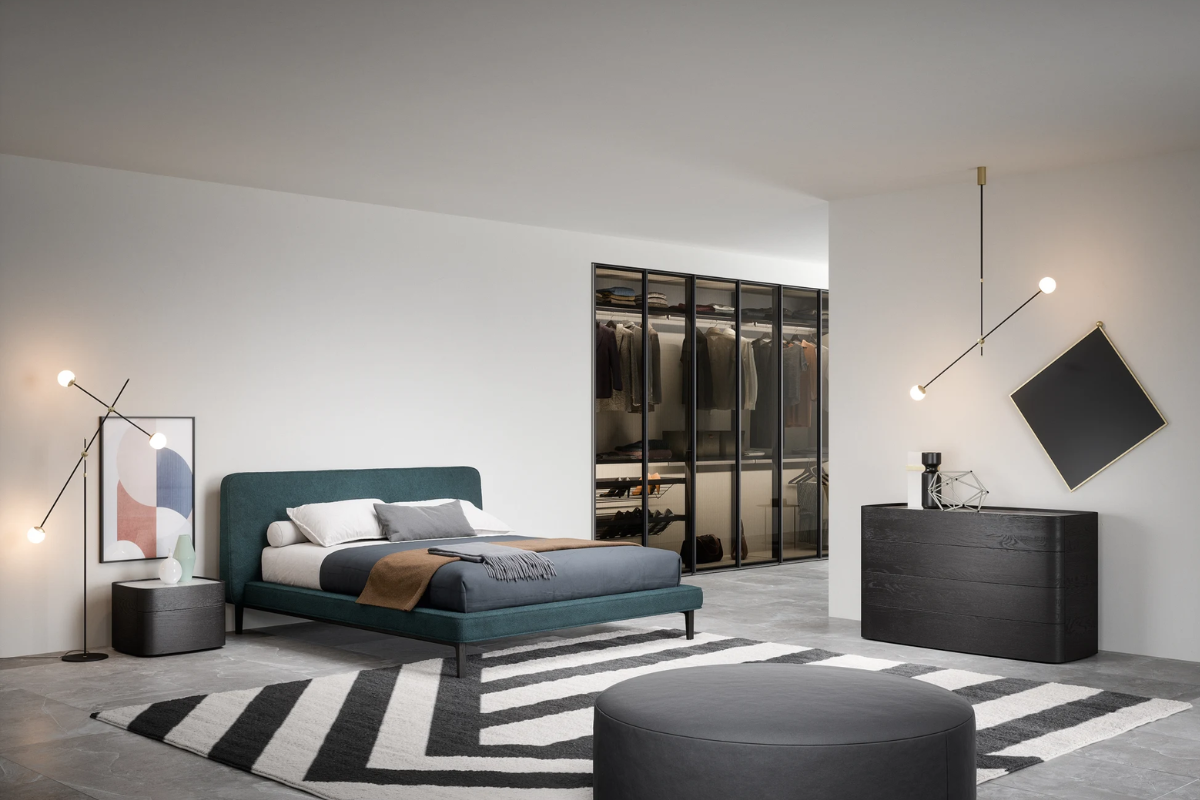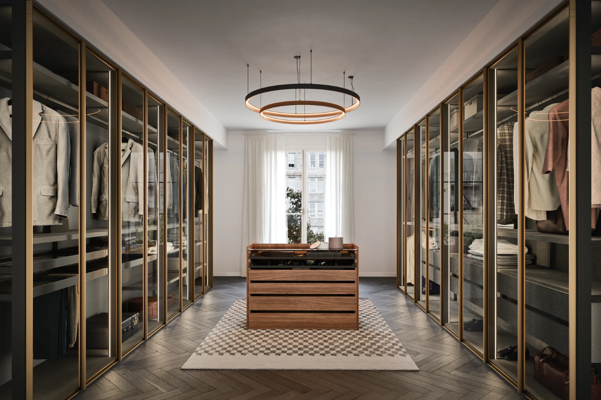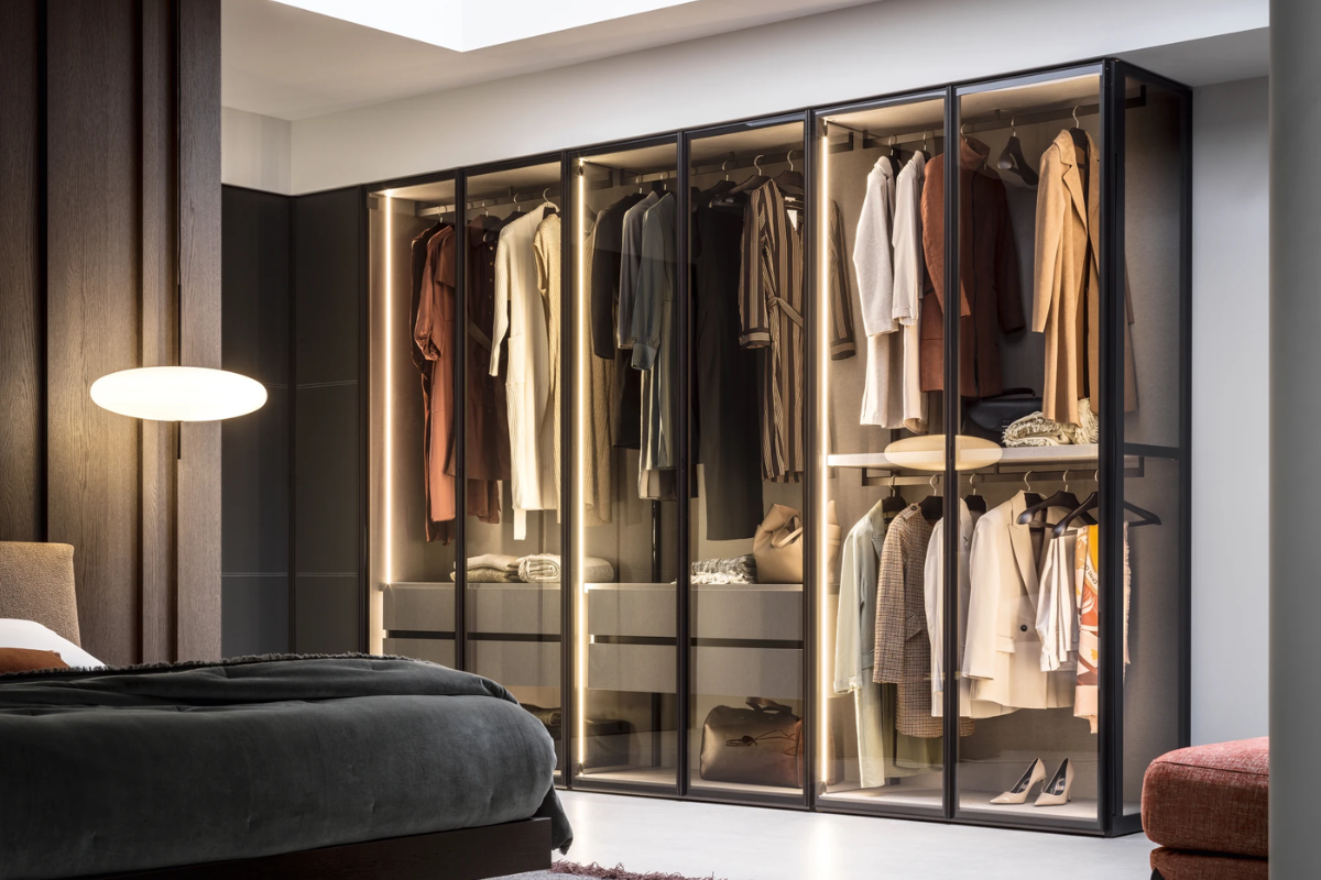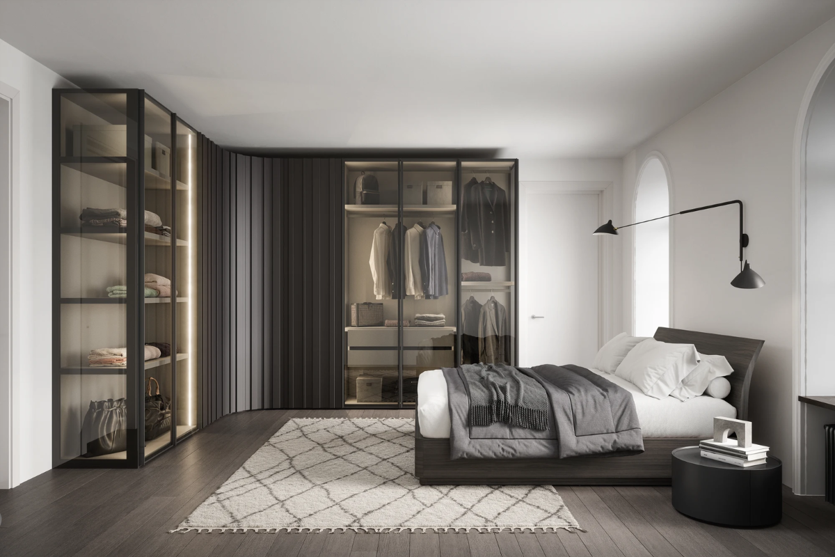 La collection Perry propose des armoires élégantes et personnalisables, mêlant cadre métallique et panneaux en verre ou en matériaux nobles comme le cuir. Combinables entre eux, les différents types de portes permettent de créer un rangement parfaitement adapté à vos besoins. Grâce au système d’ouverture Panorama à 180°, l’accès à l’intérieur est facilité, même dans les angles. Perry allie finesse, modularité et fonctionnalité. Découvrez-la dans notre showroom à Soignies et concevez votre armoire sur mesure.