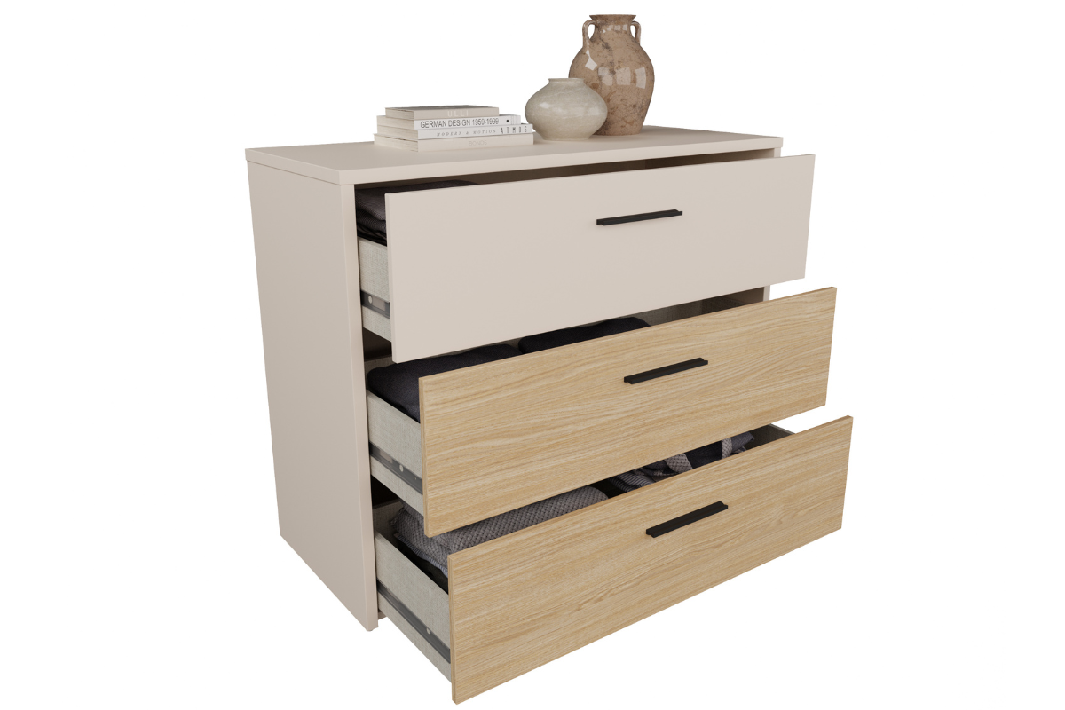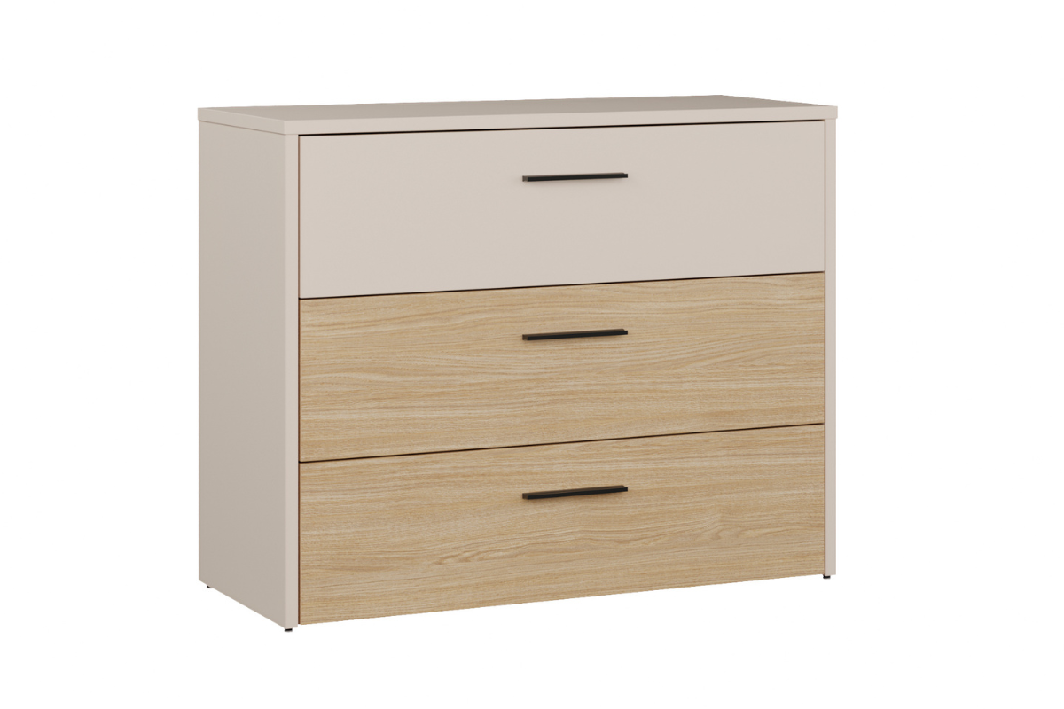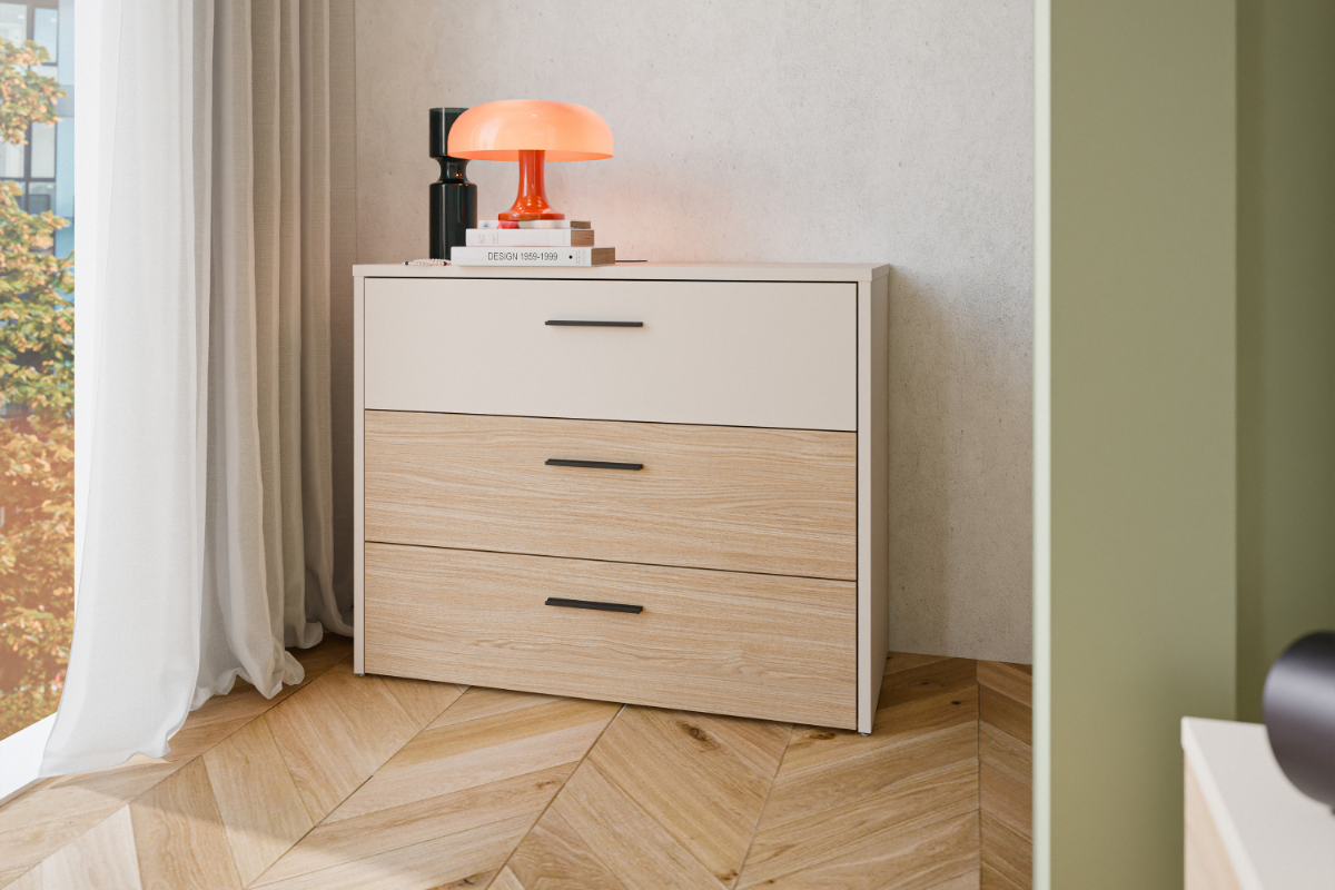 La commode Arno séduit par son design moderne et ses finitions élégantes. Son association chêne Elegancia et sable cachemire apporte une touche douce et lumineuse à votre intérieur. Dotée de 3 tiroirs spacieux, elle offre un espace de rangement pratique pour organiser vos vêtements et accessoires au quotidien. Un meuble fonctionnel et raffiné à découvrir chez Meubles Belot.
