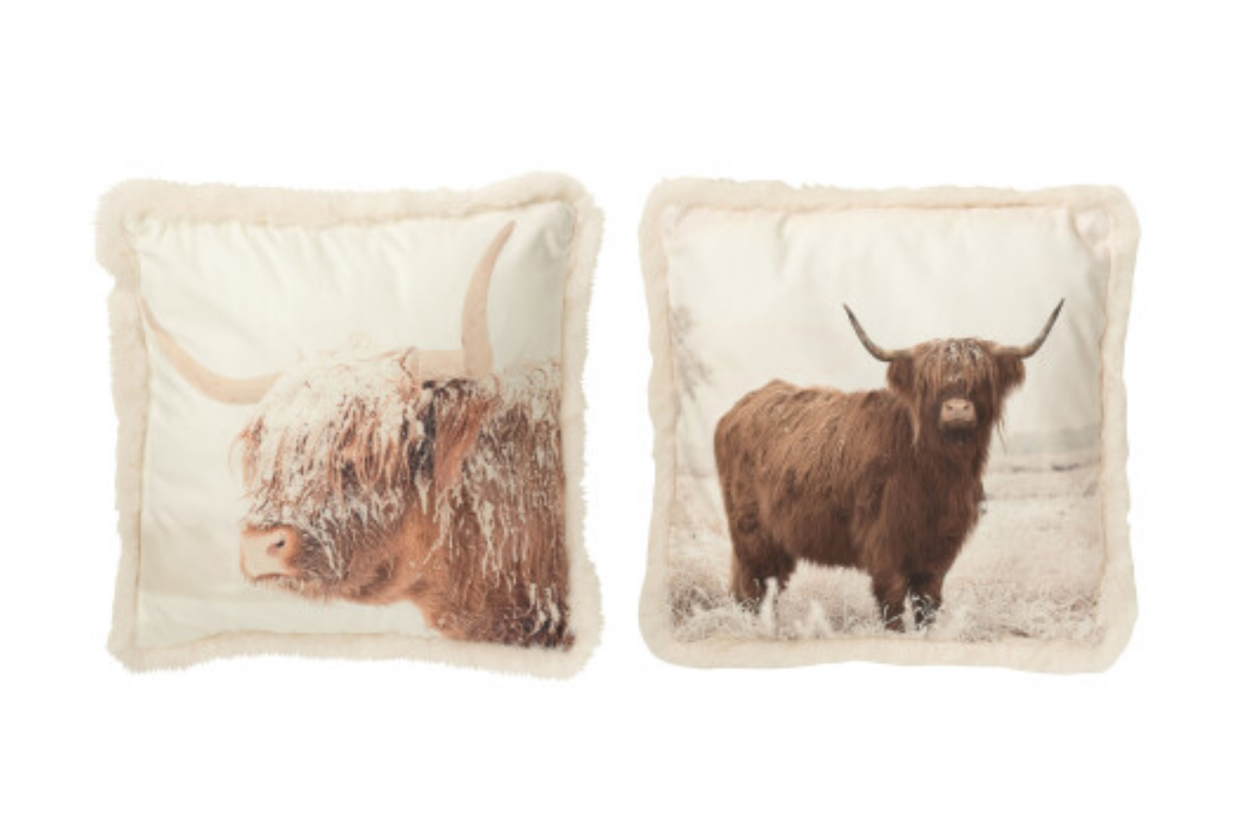 Ces coussins Yack en polyester blanc cassé et marron, vendus par assortiment de 2, apportent une touche chaleureuse et nature à votre intérieur. Leur motif animalier et leur texture douce créent une ambiance cocooning et authentique, à découvrir chez Meubles Belot.