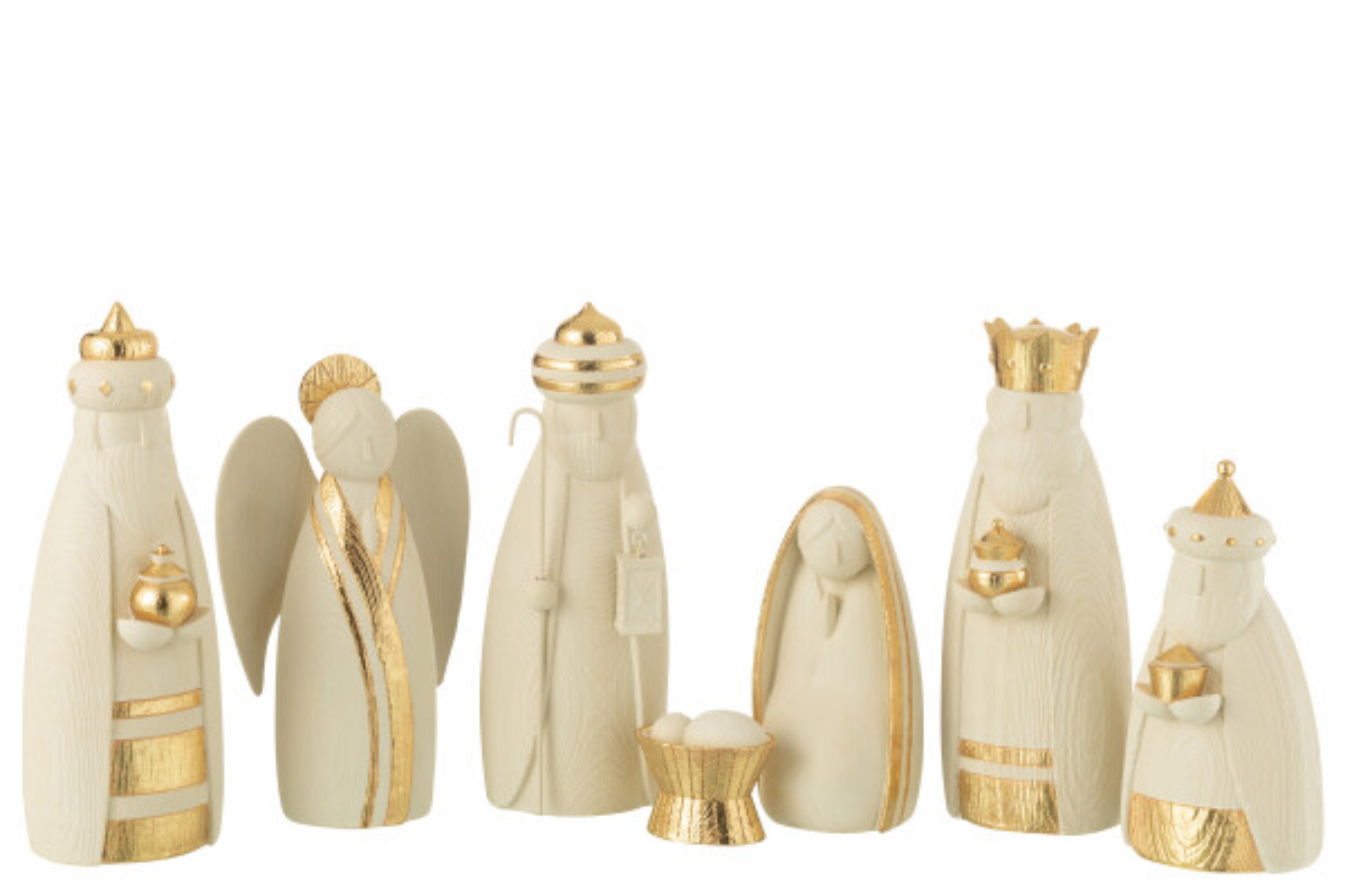 La crèche 7 pièces en résine blanc et or apporte une touche d’élégance et de douceur à votre décoration de Noël. Ses finitions dorées subliment la scène traditionnelle de la Nativité, disponible chez Meubles Belot.