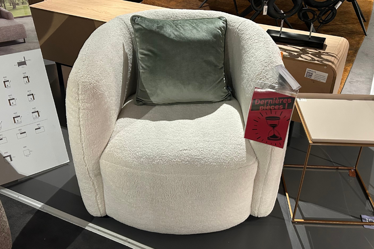 Modèle d'exposition ou stock restant. Le fauteuil BUSCA séduit par ses lignes douces et son allure contemporaine. Revêtu d’un tissu Cat E Beer 200 dans un ton crème lumineux et chaleureux, il apporte une touche de douceur à votre intérieur. Confortable et raffiné, il s’intègre parfaitement dans un salon, un coin lecture ou une chambre cosy. À découvrir chez Meubles Belot pour une assise élégante et pleine de charme !