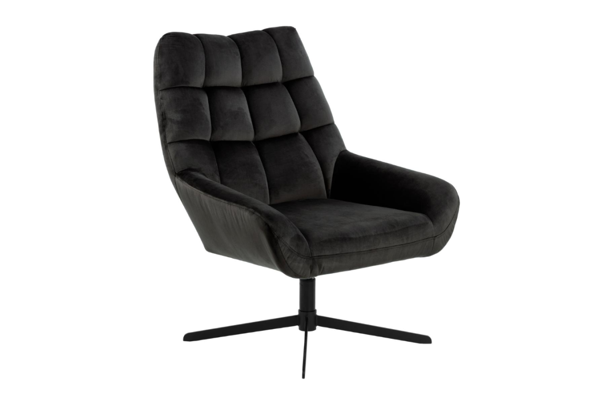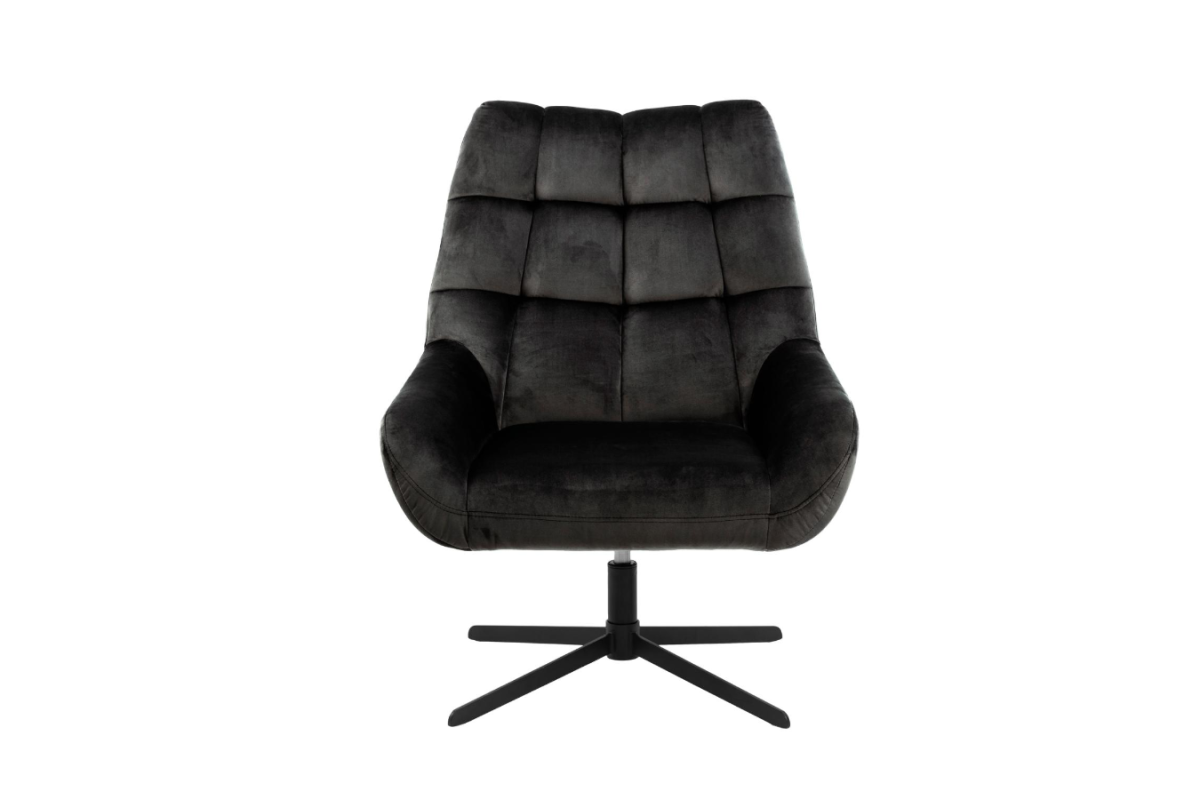 Une pièce parfaite pour ceux qui recherchent un style décontracté. La chaise pivotante aux coutures carrées a une forme accueillante. Le pied noir à 4 branches pivotant complète le style et soutient le siège. Revêtement en tissu Vic gris foncé 28.