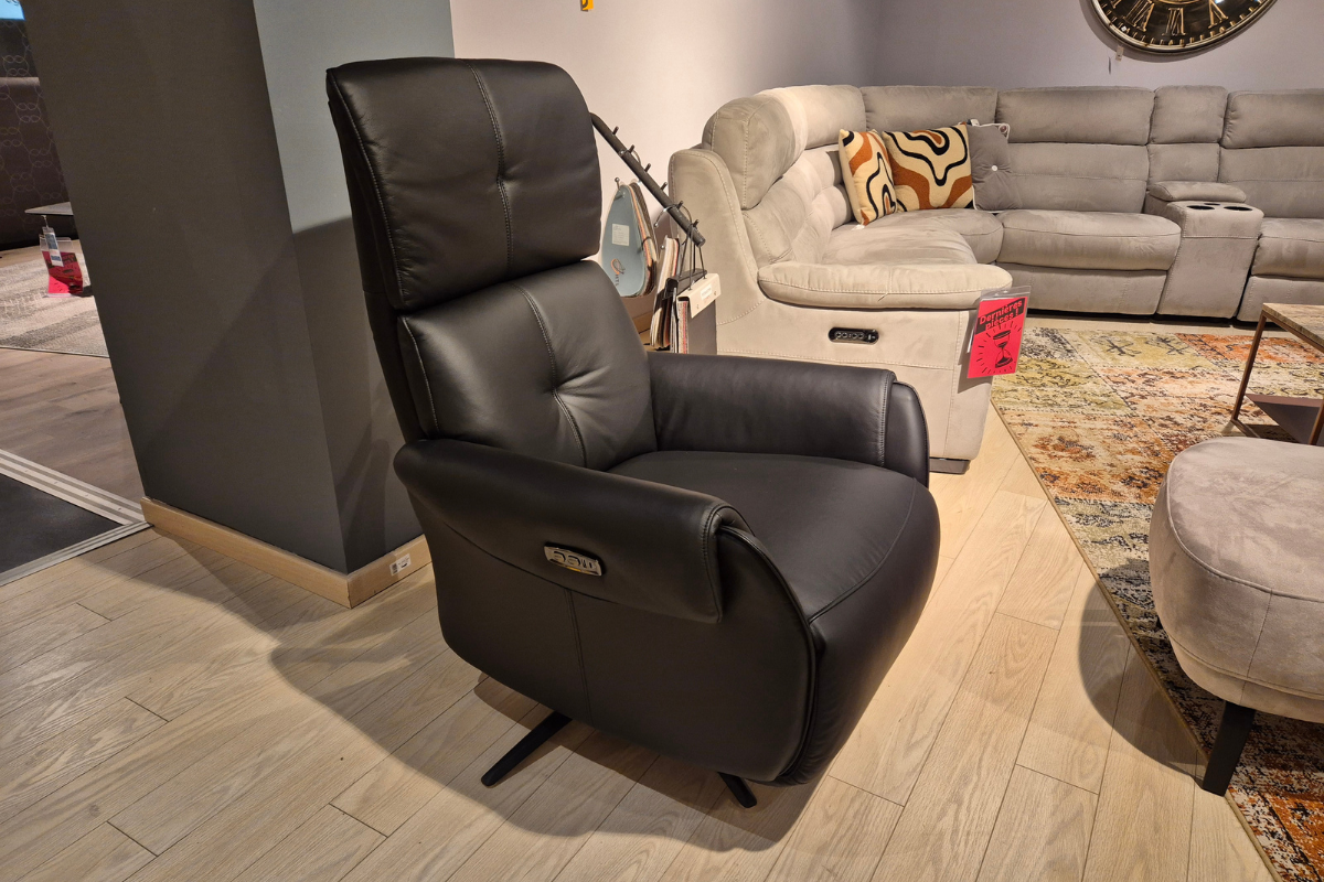 Modèle d'exposition ou stock restant. Relax VIOLIN avec 2 moteurs et batterie en cuir noir, avec tétière régable pour un confort décuplé. Venez essayer son confort relaxant dans notre showroom à Soignies.