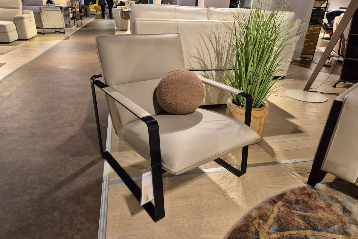 Modèle d'exposition. Fauteuil SANDY en cuir couleur Ice de la marque Calia Italia. Design italien et qualité sont au rendez-vous. A découvrir en magasin.