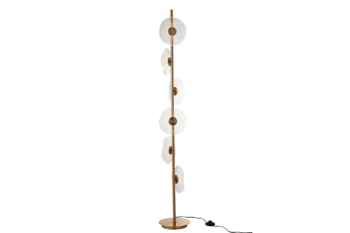 Le lampadaire LED Fleur en métal et plastique finition or se distingue par son design aérien et floral. Ses diffuseurs en forme de pétales apportent une touche sculpturale tout en diffusant une lumière douce et élégante, idéale pour sublimer un salon ou une chambre. À découvrir chez Meubles Belot.