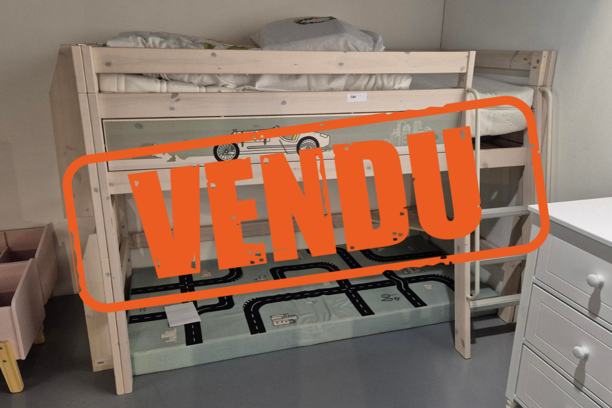 Modèle d'exposition. Lit mi-haut avec échelle inclinée couleur White Wash. Sommier Luxe inclus, matelas non inclus. Venez le découvrir dans notre showroom Meubles Belot à Soignies.