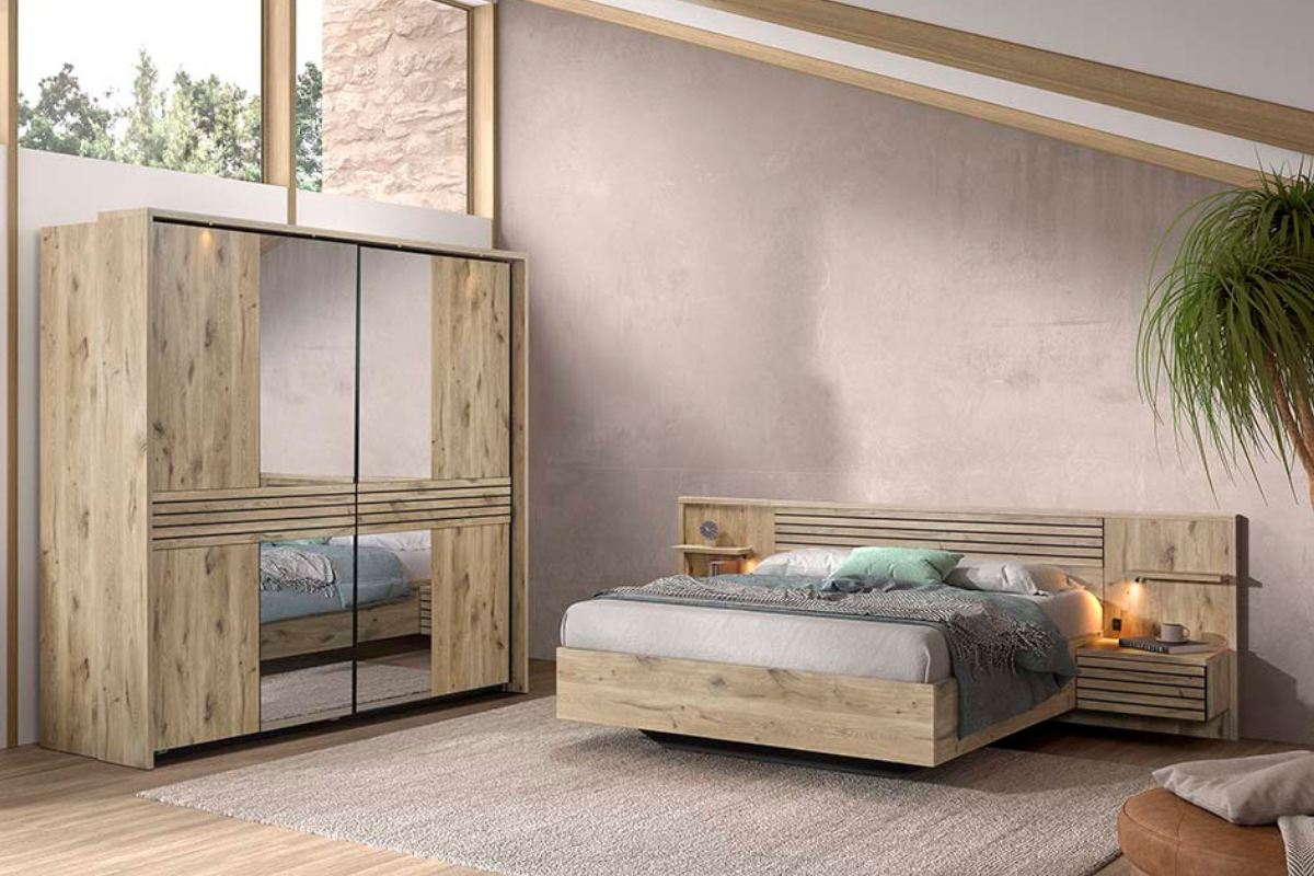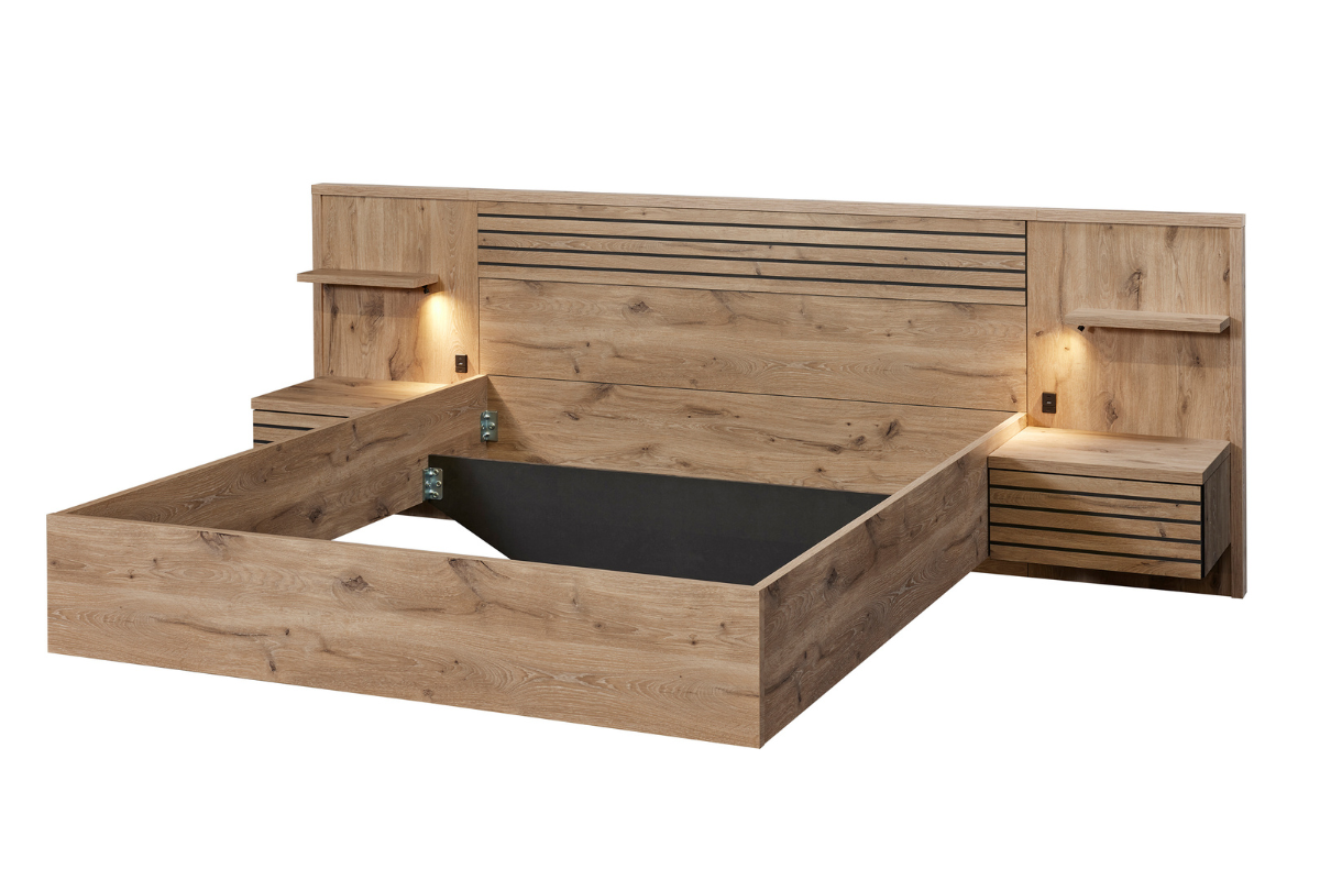 Le lit Tanya 140x190 se distingue par son design moderne et chaleureux. Sa finition Canyon Oak met en valeur la beauté naturelle du bois, tandis que les lignes noires ajoutent une touche contemporaine. Pratique et élégant, il est équipé de traverses solides et de chevets intégrés avec éclairage pour un confort optimal. Un ensemble raffiné à découvrir chez Meubles Belot.