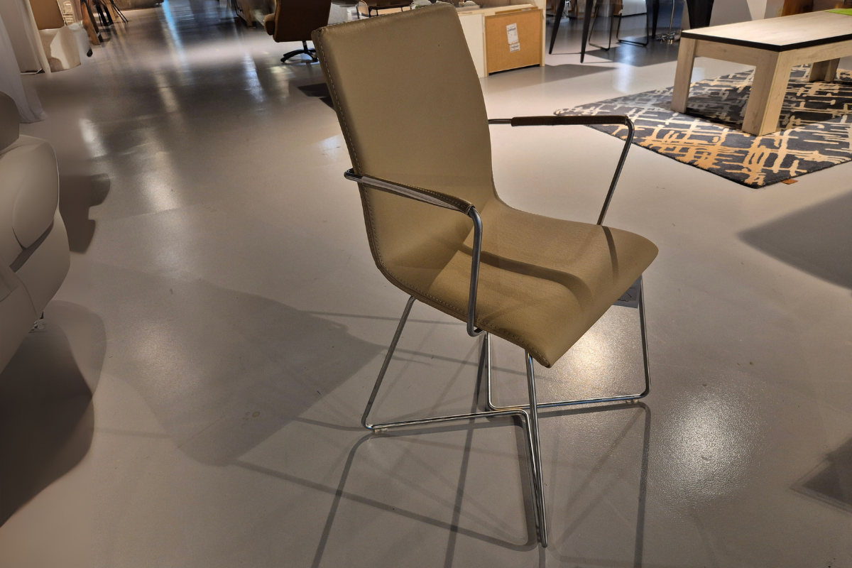 Modèle d'exposition. Lot de 2 fauteuils à accoudoirs avec une assise en couleur camel.