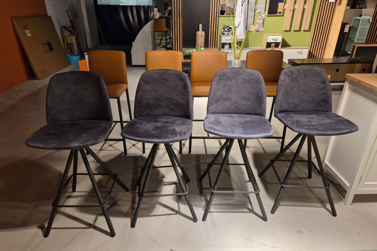 Modèle d'exposition. Lot de 4 chaises haute Barfigaro de la marque Perfecta, en revêtement gris et pieds anthracite : un modèle intemporel et confortable.