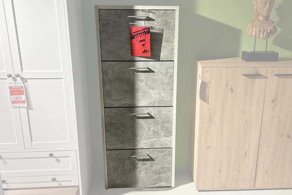 Modèle d'exposition. Le meuble à chaussures Fulda allie fonctionnalité et design industriel avec ses quatre abattants en finition béton structuré, subtilement encadrés de blanc pour un contraste élégant. Ses poignées chromées apportent une touche contemporaine à cet indispensable de l'entrée, le tout dans un format élancé qui s'intègre sans encombrer. Venez le découvrir dans notre showroom chez Meubles Belot.