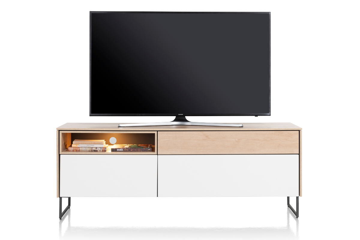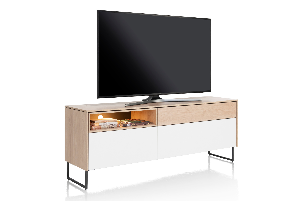 Le meuble TV LINDFIELD est composé de 3 tiroirs sans poignée: 3 avec face blanche, une en finition chêne et une niche avec éclairage. Venez le découvrir dans notre showroom Meubles Belot à Soignies.