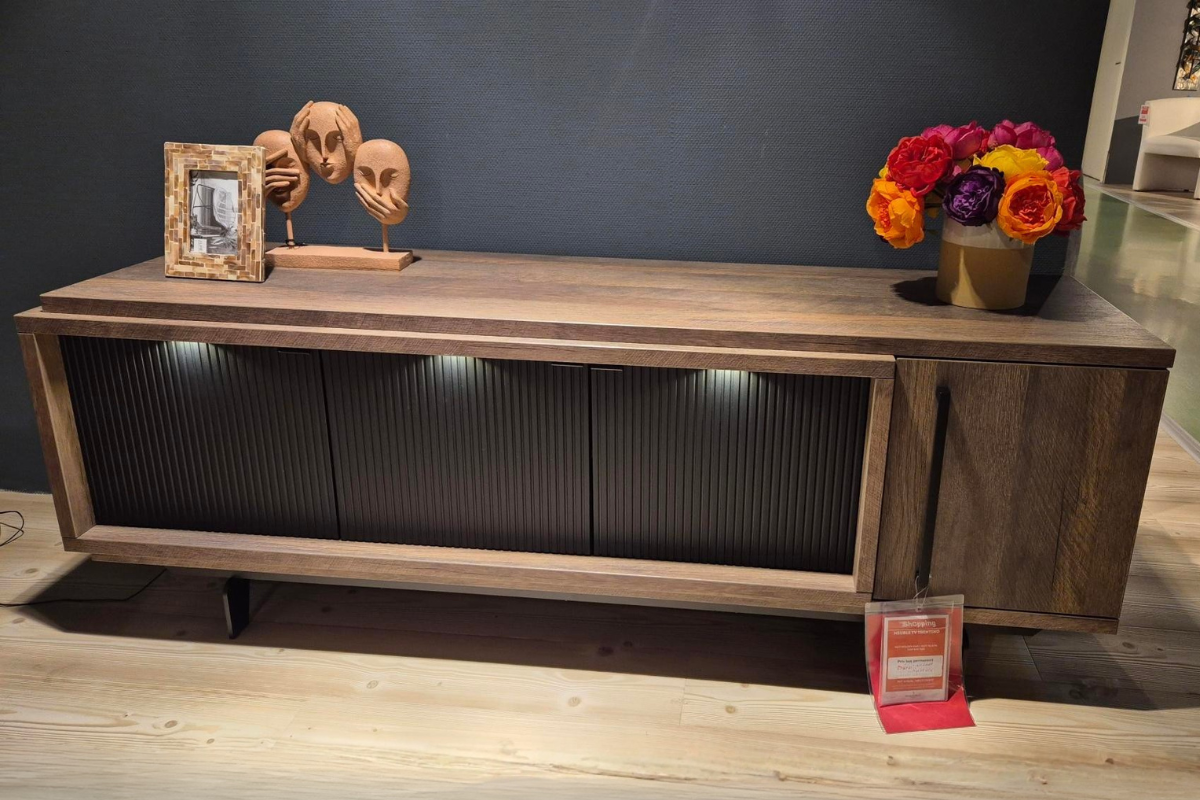 Modèle d'exposition ou stock restant. Meuble TV large 4 portes de couleur chêne doré noir mat d'un style contemporain. Venez le découvrir dans notre showroom Meubles Belot à Soignies.
