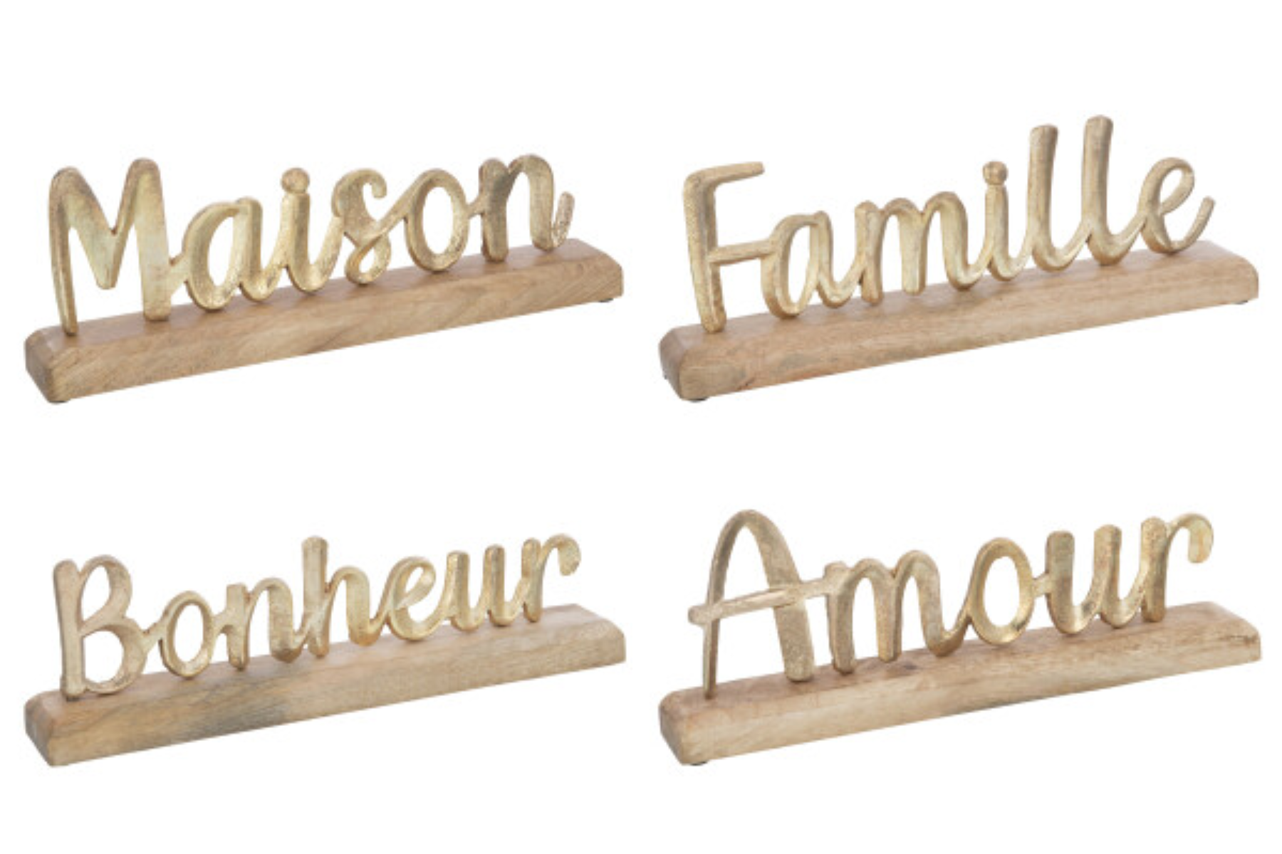 Ces mots décoratifs “Maison”, “Famille”, “Bonheur” et “Amour” apportent une touche chaleureuse et élégante à votre intérieur. Réalisés en aluminium doré sur une base en bois naturel, ils allient raffinement et authenticité pour sublimer une étagère, une console ou une table. Des créations pleines de sens qui insufflent douceur et harmonie à votre décoration, à découvrir chez Meubles Belot.