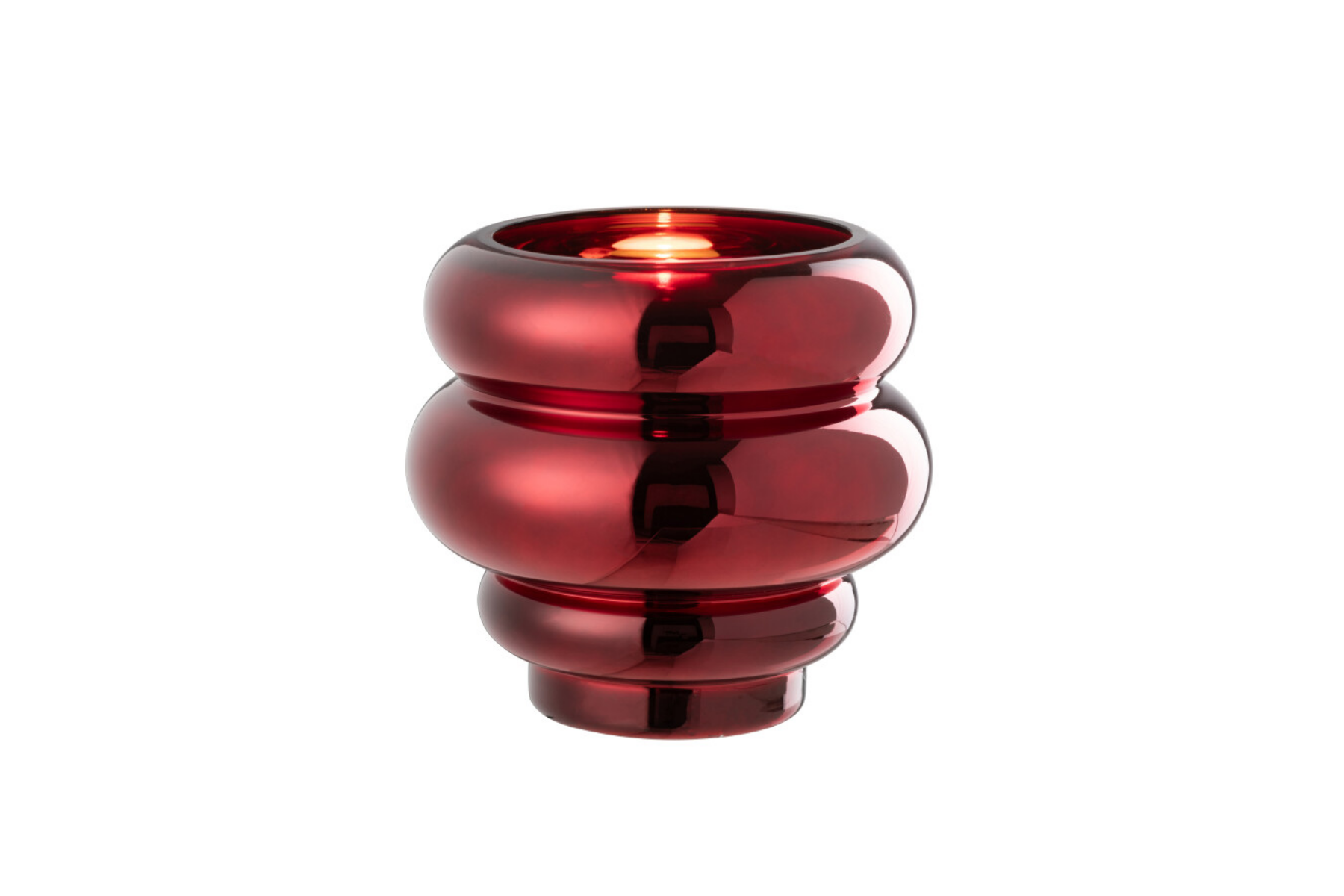Avec son design ondulé et sa finition brillante, le photophore/vase Cléa en verre rouge foncé allie élégance et modernité. Il crée une ambiance chaleureuse et raffinée, à découvrir chez Meubles Belot.