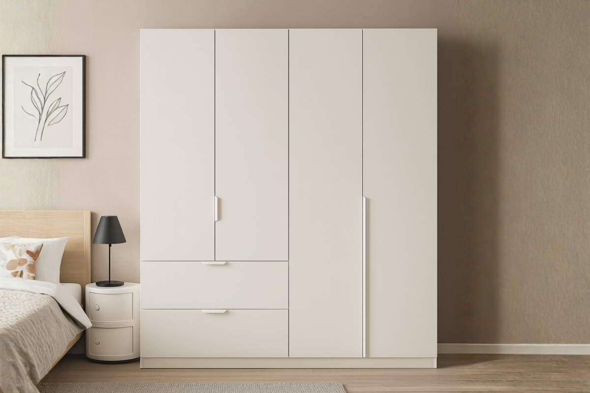 Avec son design sobre et raffiné, le Placard Quadra Spin en finition champagne allie élégance et praticité. Composé de 4 portes et 2 tiroirs, il offre un bel espace de rangement tout en s’intégrant harmonieusement dans une chambre moderne et lumineuse. À découvrir chez Meubles Belot