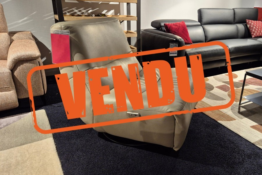 Modèle d'exposition. Découvrez le fauteuil relax BUMBLE en cuir Corso Cloud Beige : une invitation au confort. Son design arrondi et minimaliste cache un mécanisme électrique intégré, vous permettant d’incliner le dossier et de relever les jambes en un seul geste. Conçu pour s’adapter à votre espace avec style, il repose sur une base pivotante discrète. À retrouver chez Meubles Belot pour un moment de détente.
