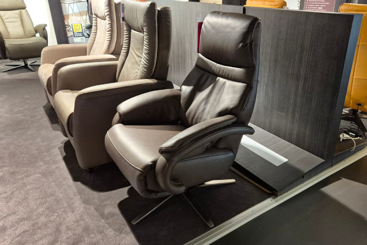 Modèle d'exposition. Ce fauteuil relax de la marque HUKLA possède une têtière électrique, 3 moteurs, hauteur d'assise de 47cm et profondeur d'assise de 52cm. Il est en cuir Rodeo Goa. Profitez de son confort Prestige, venez l'essayer dans notre showroom à Soignies.