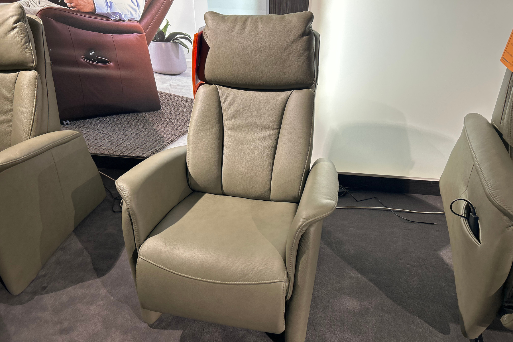 Modèle d'exposition. Le relax HU EC22138 allie ergonomie Piccolo et confort sur mesure avec sa fonction G3H à 3 moteurs, son assise F1 souple et sa têtière MOKV. Habillé du cuir Belvita olive, avec accoudoirs V1 et pieds RO rouleaux, il offre une détente élégante et personnalisée, à découvrir chez Meubles Belot.
