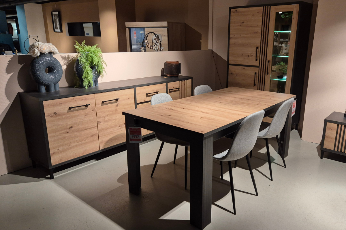 Modèle d'exposition ou stock restant. Découvrez la salle à manger Berlijn au style industriel et au charme naturel. Cette collection se distingue par la combinaison du bois clair et du noir, créant un contraste élégant. Le buffet offre un vaste espace de rangement avec ses portes et tiroirs, idéal pour organiser votre vaisselle et vos objets de table. La table, avec ses lignes simples et son plateau en bois, est parfaite pour accueillir vos convives avec style et convivialité. La vitrine complète cet ensemble en proposant un espace de rangement supplémentaire. Venez la découvrir dans notre showroom Meubles Belot à Soignies.