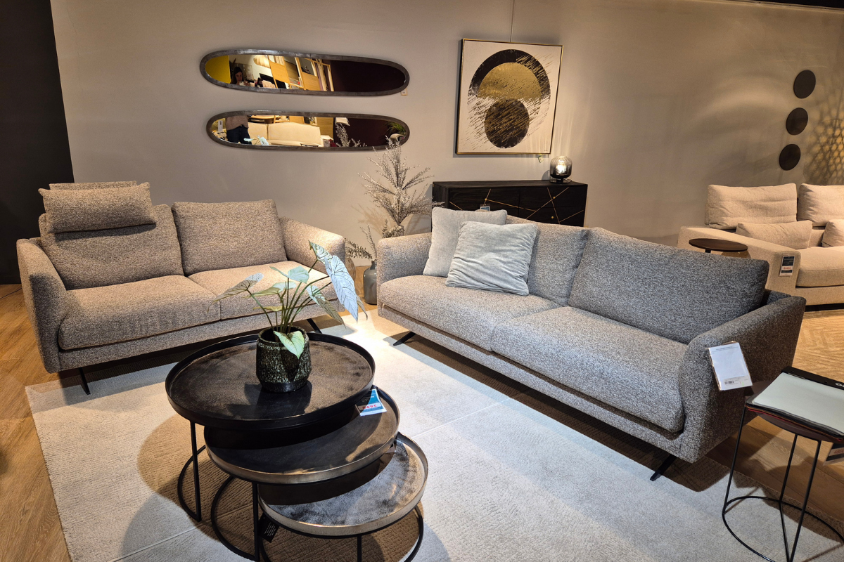 Modèle d'exposition. Cet ensemble 3,5 places + 2,5 places de la collection DIVA de chez Olta s'intègrera à la perfection dans votre intérieur. Les coussins d'assise comprennent deux couches de mousse, dont la dernière est à mémoire de forme, et les coussins de dossier sont en plume d'oies et en silicone ce qui apporte à ce canapé une assise moelleuse. Ses pieds modulables lui procurent un design moderne. Venez le découvrir dans notre showroom Meubles Belot à Soignies.